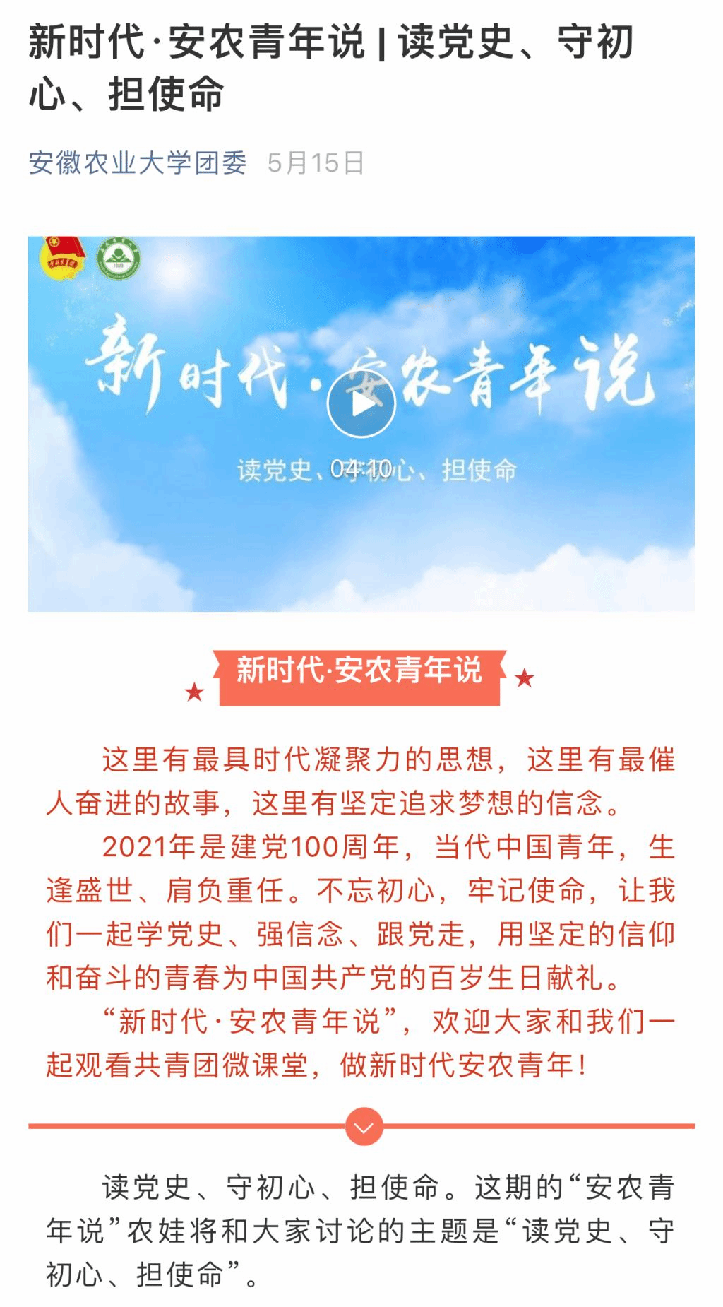 针对移动互联网原居民“00后”大学生的特点,校团委深入思考“如何营造清朗网络空间,优化文体育人环境,不断增强文体育人的辐射力、影响力和引领力?”这一重要育人问题。通过多年探索,逐步形成“微博、微信、QQ空间、网站”四位一体的网络网络育人平台,采用“互联网+品牌活动”“互联网+思想引领”“互联网+知识竞赛”“体育竞赛+直播”等形式,不断扩大文体育人的有效覆盖面和影响力。五年来,校团委通过网络举办“神农大讲堂”“我的青春故事”“新时代·安农青年说”“创禾进行时”等活动300余场,累计教育师生1000余万人次,特别是新媒体平台发布的《2021安农毕业歌》、2020届毕业MV《青禾少年》主题文化产品,微信公众平台浏览量最高达2.5万次/条,推送的网络文化产品单个话题最高阅读量达245万人次,校团委微信公众号获2017年“全国高校新媒体评选”最具人气奖。