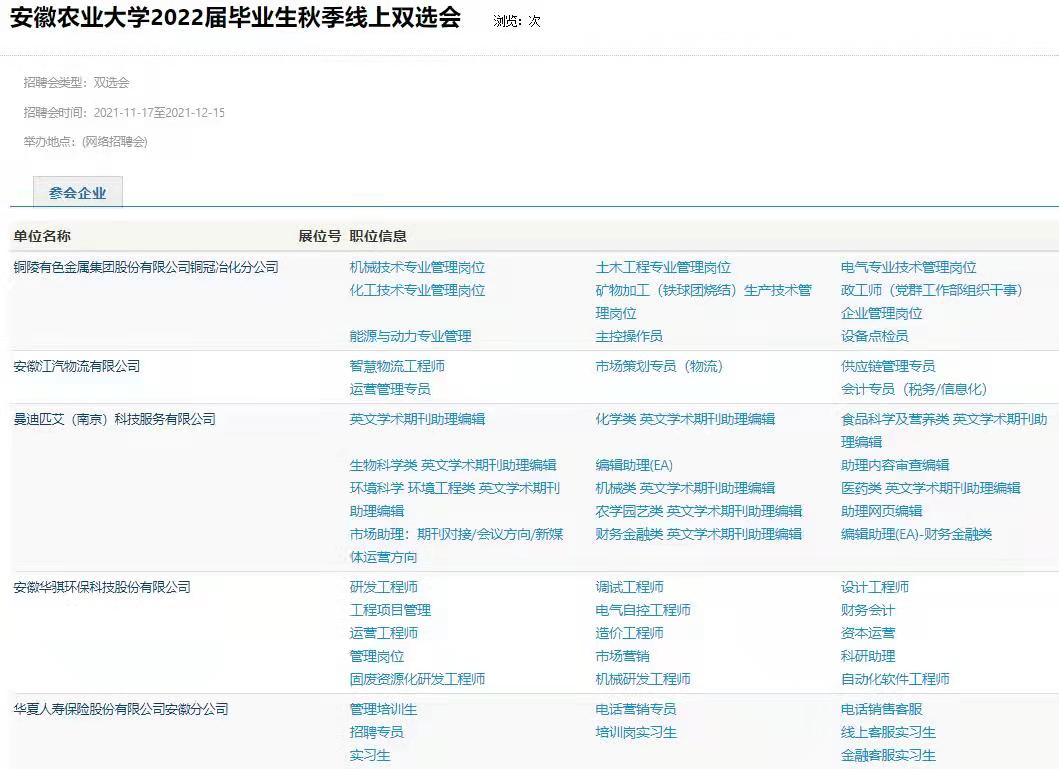 本网讯 近期,国内新冠肺炎疫情呈散发态势,疫情防控形势日趋严峻。根据省政府、教育厅和校疫情防控领导小组相关通知要求,学校暂停各类线下校园招聘活动。同时,为深入贯彻落实党中央、国务院关于“稳就业”、“保就业”工作任务部署,切实保障毕业生的身体健康和就业权益,确保毕业生求职安全,最大限度减少疫情对毕业生求职的影响,持续做好我校毕业生就业工作,11月17日,我校举办安徽农业大学2022届毕业生秋季线上双选会。