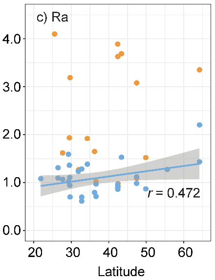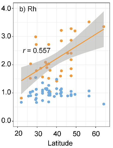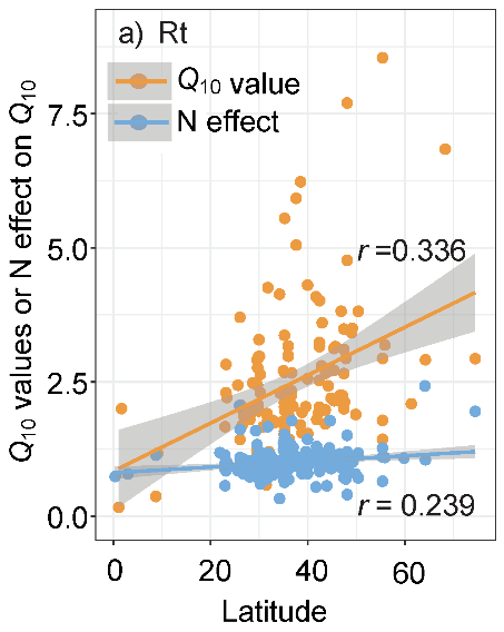 土壤碳释放对全球变暖的响应在很大程度上取决于土壤呼吸对气温升高的响应程度,即温度敏感性(Q10),但在大气氮沉降日益增加的背景下,土壤呼吸与温度之间的关系是否受到影响,以及受什么因素的调控等尚不清楚。针对这一问题,该团队整合分析了168项田间试验的686条观测记录,发现土壤总呼吸和异养呼吸的温度敏感性随纬度的升高而增大;而总呼吸和自养呼吸的温度敏感性对氮沉降的响应在高纬度地区更强。相比于当代的气候条件,末次盛冰期(约22000年前)的温度与降水条件能够更好地预测土壤呼吸的温度敏感性对氮沉降的响应。古气候条件对土壤呼吸温度敏感性响应氮沉降的调控主要通过对土壤有机碳和氮含量的塑造这一遗留效应。该项研究强调了在全球变化背景下预测土壤碳动态过程时将古气候因子纳入考虑的重要性和必要性。