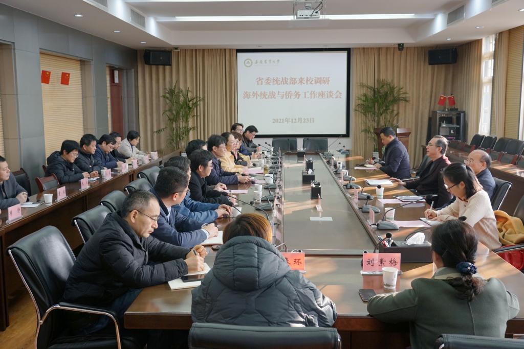 本网讯12月23日下午,安徽省委统战部副部长、省侨办主任张启明,侨务工作处处长周立新、副处长黄礼杰,侨务工作处二级主任科员何敏一行来我校调研座谈,了解侨界人士的需求和工作情况,听取侨界人士对侨办工作的意见和建议。党委常委、副校长韩军出席座谈会。侨联(侨届)人士代表、部分民主党派负责人、各学院统战委员和留学归国教师代表二十余人参加了座谈会。会议由党委统战部常务副部长崔云主持。