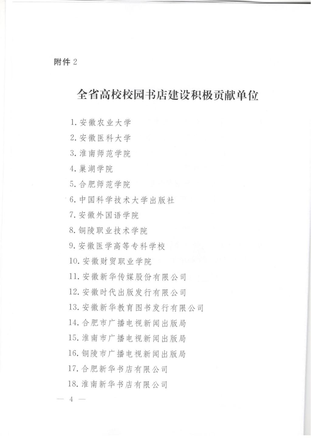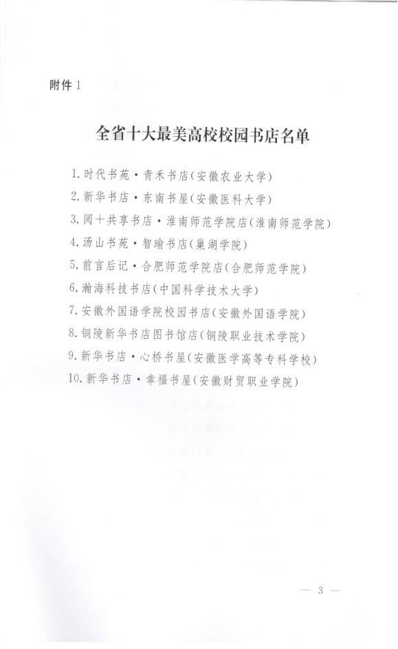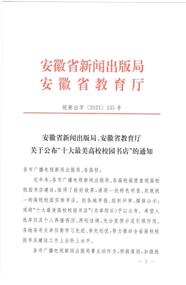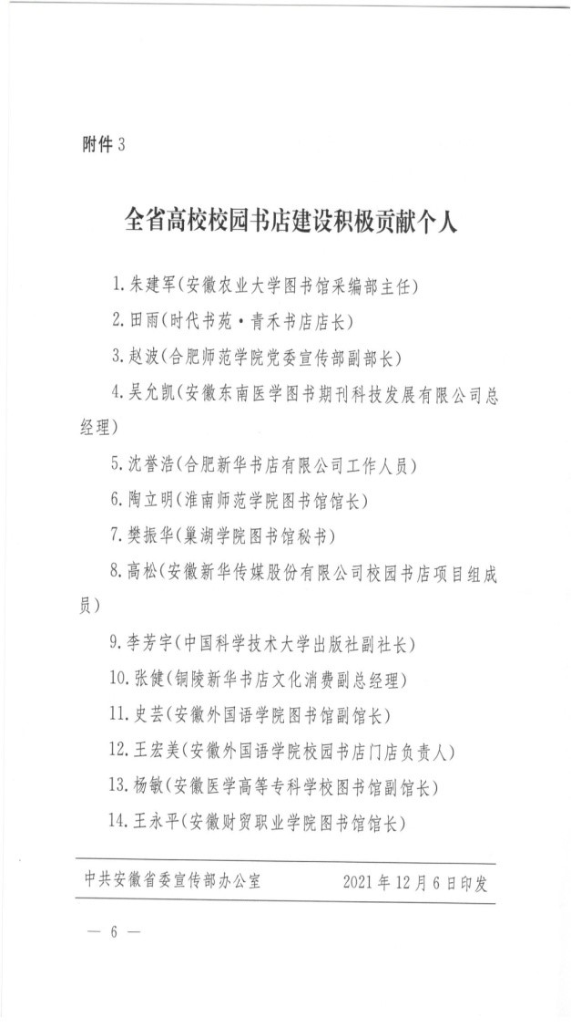 本网讯近日,安徽省新闻出版局和安徽省教育厅联合发文表彰了近年来在我省高校校园书店建设中的先进集体和个人。我校获“全省高校校园书店建设积极贡献单位”称号,青禾书店获“全省十大最美高校校园书店”称号,我校教师朱建军和青禾书店负责人田雨获得“全省高校校园书店建设积极贡献个人”称号,包揽了先进集体和先进个人的所有奖项。