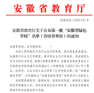 本网讯 近日,省教育厅公布了第一批“安徽省绿色学校”(含创建单位)名单,全省共有10所高校获批,我校位列其中。