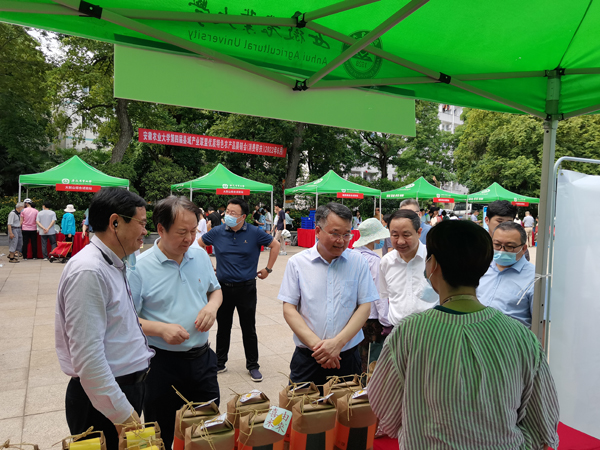 校领导常业军、裴树东、李红、操海群等参观了展销会展台,与参展企业的负责人以及专家教授们亲切交流,听取了科研成果介绍,了解了农产品销售行情。