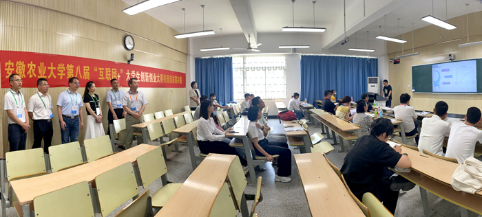 本网讯 6月21日,我校在博学楼智慧教室举办的第八届安徽农业大学“互联网+”大学生创新创业大赛校园选拔赛决赛现场答辩圆满结束。评审团由“互联网+”国赛评委、省赛评委,企业家,校内外创新创业教育领域专家构成,赛前召开了评审专家会。教务处、创新创业学院、工学院负责同志到场观看。