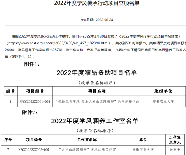 本网讯 近日,中国科学技术协会公布了《2022年度学风传承行动项目立项名单》,我校主持申报的“大别山道路精神”学风涵养工作室、“弘扬优良学风 传承大别山道路精神”系列传播作品脱颖而出获得立项,实现了我校在该类项目立项的突破。