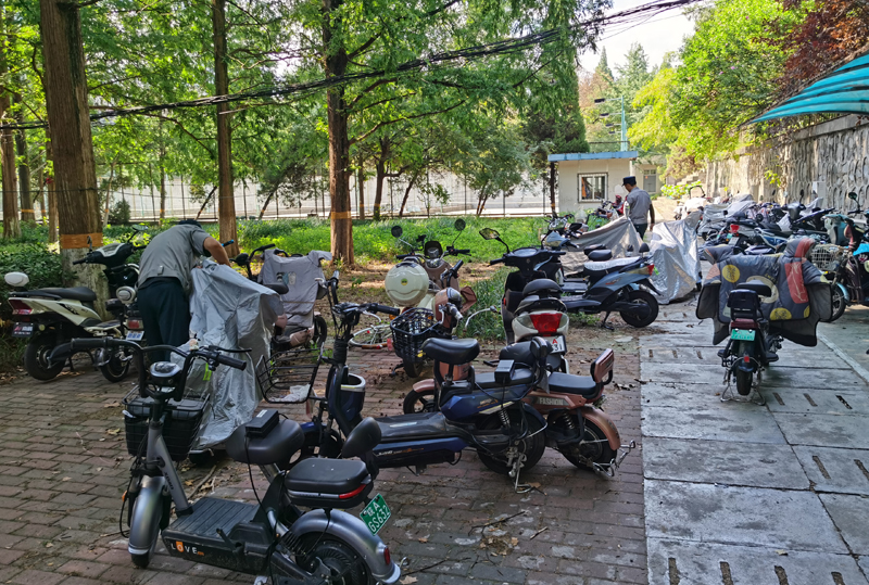 保卫处职工在摆放电动车