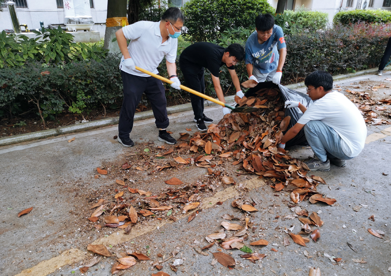工学院师生在清理绿化带中落叶