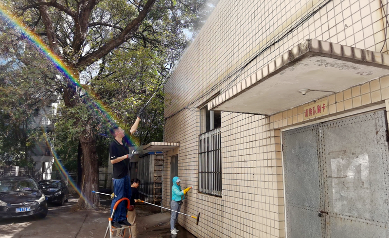 东苑食堂职工在清理房子外立面