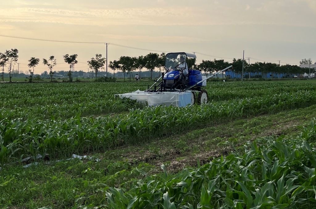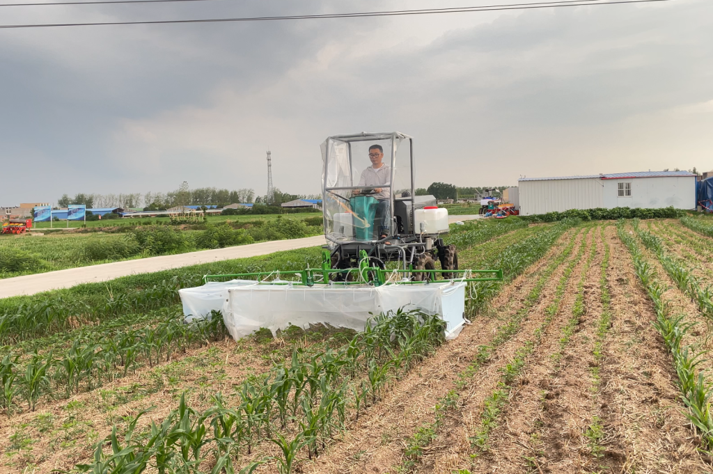 本网讯 眼下正值夏玉米拔节孕穗的关键期,我校工学院“机械强农”科研团队克服高温酷暑天气,坚持驻扎在亳州市蒙城县全国大豆—玉米带状复合种植综合试验示范基地一线,紧张有序开展“4+2”、“4+6”两种复合种植模式下机械化封闭式分控除草作业。