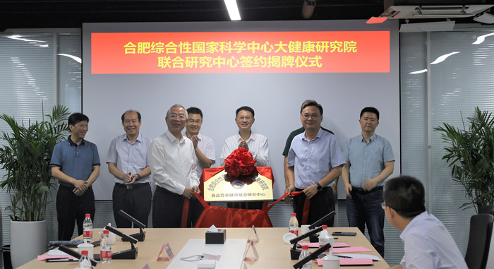 本网讯 7月29日上午,我校与合肥综合性国家科学中心大健康研究院共建食品营养健康联合研究中心签约揭牌仪式在研究院一号楼会议室举行。校党委常委、副校长操海群出席活动并讲话。省发改委党组成员、副主任徐志,合肥市委常委袁飞,合肥综合性国家科学中心大健康研究院院长田志刚院士、执行院长周荣斌,蚌埠医学院副院长陈昌杰(线上),省发改委科学中心处、合肥市发改委、市科技局、经开区,蚌埠市发改委、淮南市发改委等相关负责人出席活动。