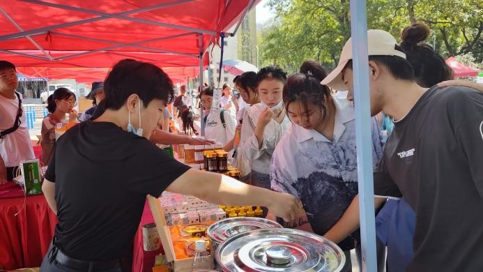 本次展销会由新农村发展研究院牵头,党政办、人事处、工会、后勤保障处、保卫处等部门组织,来自我校五个综合试验站及两个定点帮扶村所在地的20家新型经营主体60多种农产品参展。现碾鲜米、瓜果蔬菜、茶叶、蜂蜜、月饼等产品都是绿色生态的优质特色农产品,深受师生喜爱,获得广大师生一致好评。据统计,当天展销会农产品现场成交额近15万元,更多的消费者与优质特色农产品生产经营主体建立了网上购物渠道。(夏迎春 通讯员:胡翔)