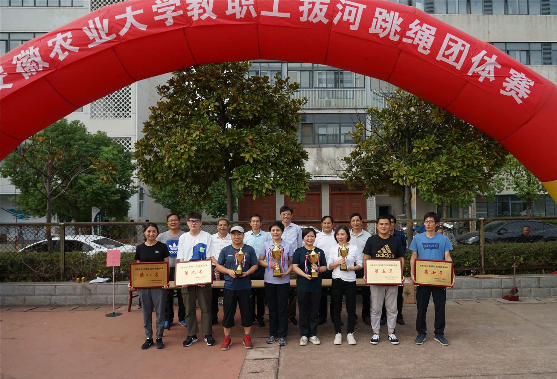 教职工拔河跳绳团体赛在校教职工活动中心南侧操场举行,20个分工会代表队参加。本次团体赛由男子拔河比赛和女子跳绳比赛组成,历经52场拔河和20场跳绳的激烈角逐,轻纺工程与艺术学院分工会获得团体第一名,后勤保障处分工会获得团体第二名,动物科技学院分工会获得团体第三名,理学院分工会、机关三工会、工学院分工会、植物保护学院分工会、机关一工会进入八强。(通讯员:薛美霞)