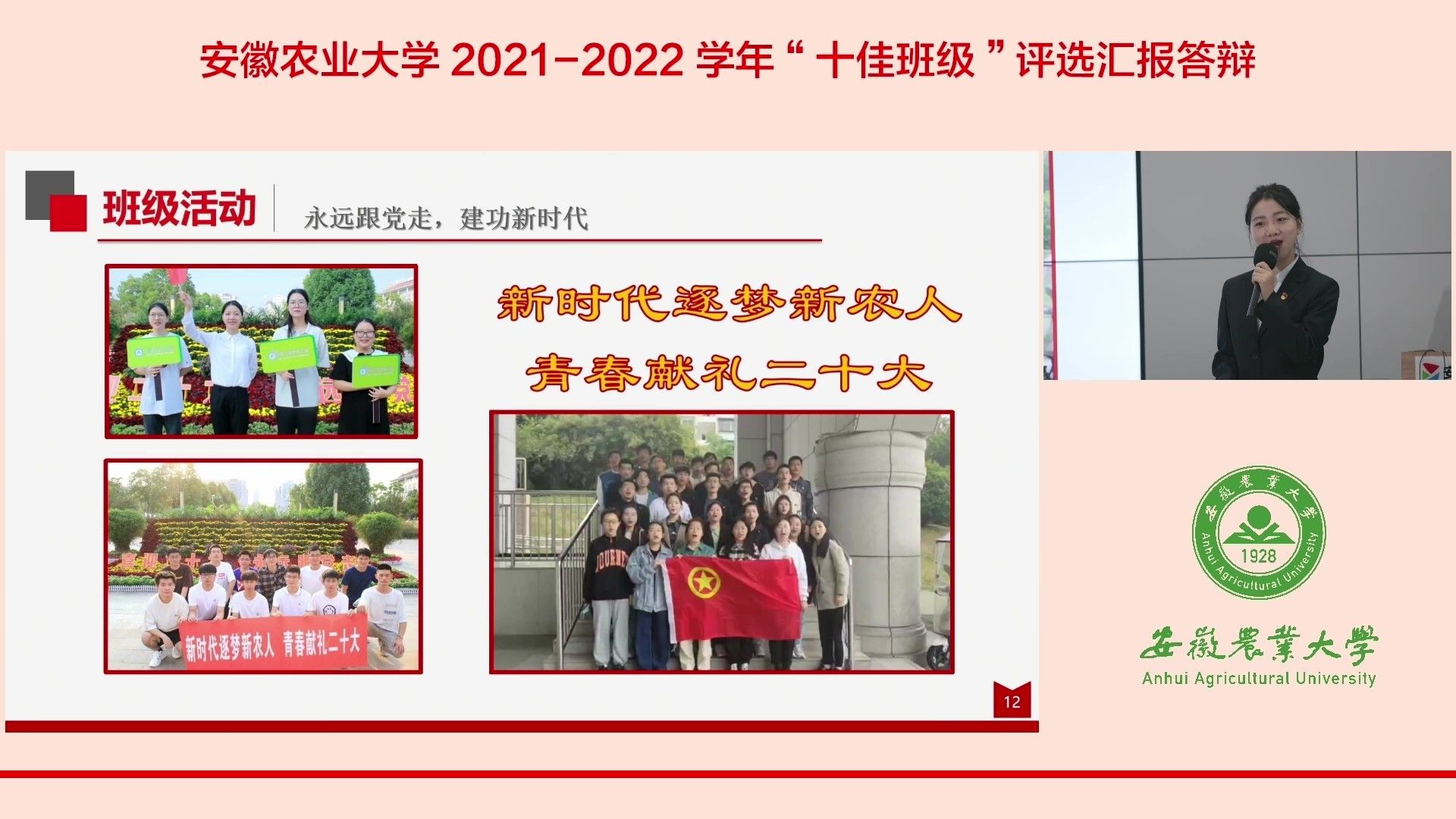 我校高度重视班集体建设,积极在全校班级中树立典型、宣传先进,发挥班集体在学生思想政治教育工作中的影响力、感召力和凝聚力,强化先进班集体的示范引领作用,全面推进优良学风班风建设。2021-2022学年“十佳班级”评选活动前后历时近2个月,经过班级申报、学院推荐、学工部(处)审核和线上集中展示等环节,最终有14个班级进入答辩汇报环节,前后共有1.6万人次参与展示投票和线上观看。 (作者:卢伟,一审:杨金丹,二审:周涛,三审:曹雷)