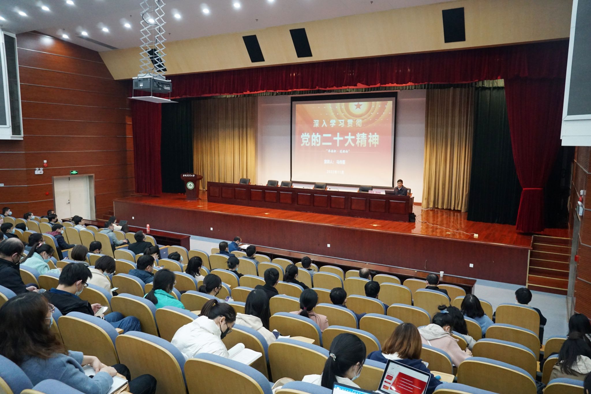 本网讯 11月23日下午,我校在图书馆第一报告厅举办“学习二十大 奋进新征程”高层次人才专题培训班暨2022年新进教师岗前培训校本培训开班式。校常务副校长马传喜出席会议并作《深入学习贯彻党的二十大精神》专题报告。开班式由党委教师工作部、人事处、人才办相关负责同志主持。2022年新入职高层次人才、新进教师160余人参加。