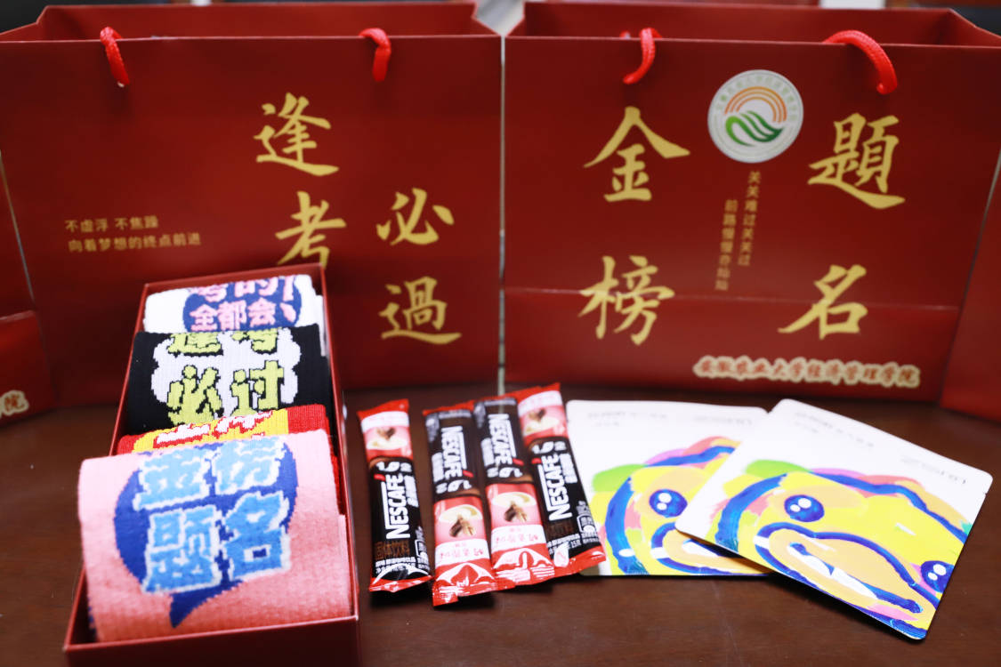 为了给考研的同学们鼓劲加油,缓解同学们考前焦虑和紧张等情绪,经济管理学院贴心地为487名考研学子每人准备了一份“考研能量加油包”,既有蒸汽眼罩,也有咖啡,更有绣着“逢考必过”“金榜题名”“上岸成功”等祝福语的袜子。