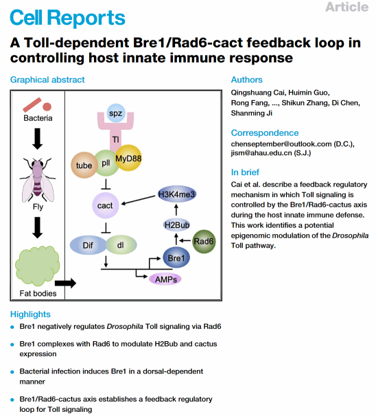 本网讯 天然免疫系统是机体抵抗外源病原微生物入侵的第一道防线。果蝇是研究天然免疫调控分子机制的最理想动物模型之一。近日,我校生命科学学院计山明教授团队在果蝇天然免疫领域的最新研究成果“A Toll-dependent Bre1/Rad6-cact feedback loop in controlling host innate immune response”在线发表于《细胞通讯》(Cell Reports)。