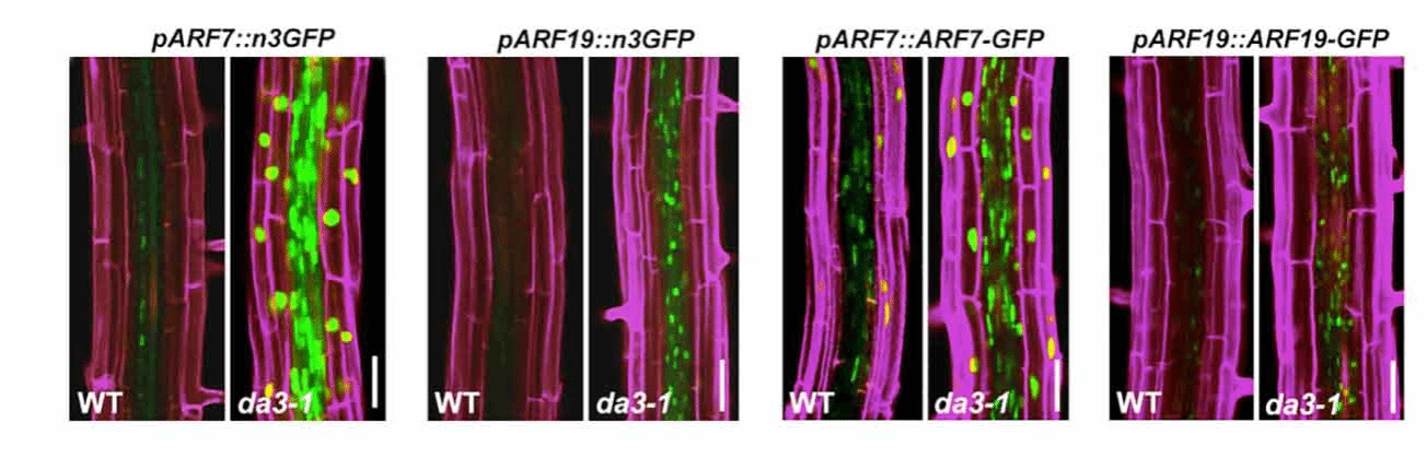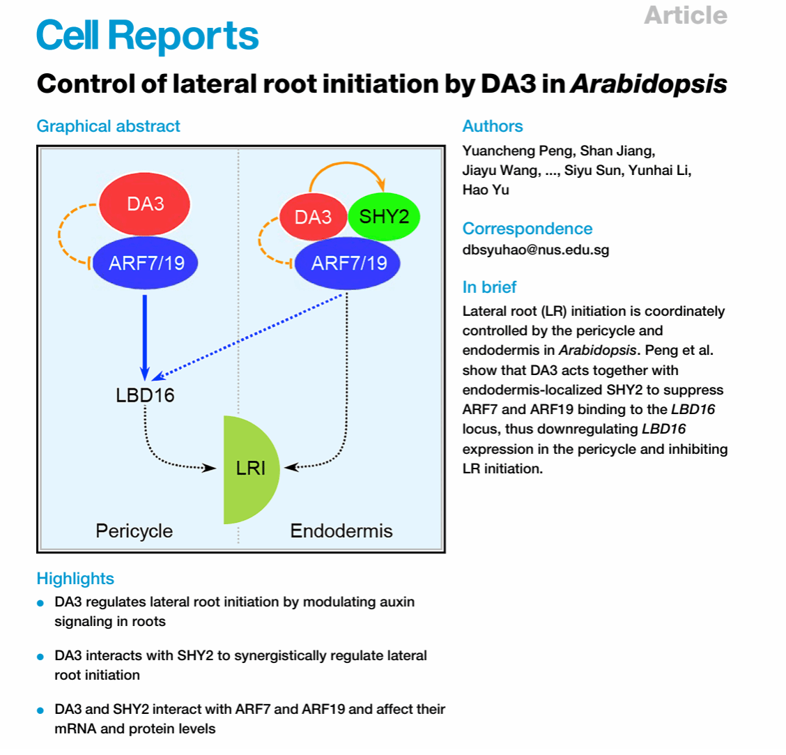 在拟南芥中,侧根的起始由中柱鞘和相邻的内皮层控制。研究团队证明,泛素特异性蛋白酶DA3通过调节中柱鞘和内皮层中的生长素信号来调节LR的起始。DA3分别在mRNA和蛋白水平上负调控生长素响应因子ARF7和ARF19在中柱鞘和内皮层中的表达,并正向调节作用生长素信号抑制因子SHY2在内皮层中的稳定性。DA3与ARF7/19相互作用,从而抑制其与侧根发育起始相关蛋白LBD16启动子的结合,并最终抑制LBD16在中柱鞘中的正常表达。此外,SHY2还与ARF7和ARF19相互作用并增强DA3对ARF7/19的抑制作用,从而调节LBD16在中柱鞘中的表达。