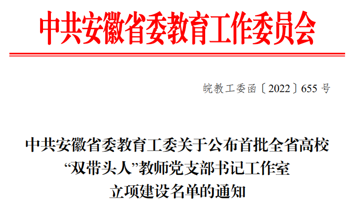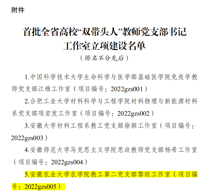 本网讯 近日,中共安徽省委教育工委发布《关于公布首批全省高校“双带头人” 教师党支部书记工作室立项建设名单的通知》,首批共遴选建设30个全省“双带头人”教师党支部书记工作室。我校农学院教工第二党支部黎珉工作室获批立项。