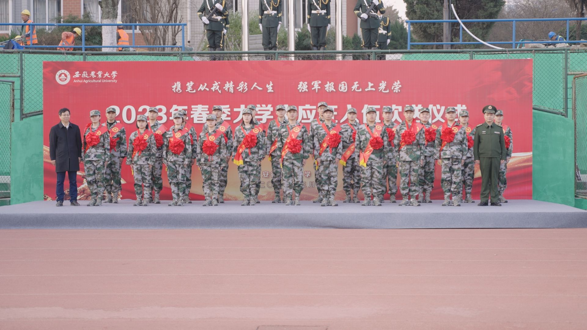 仪式上,退役士兵代表合唱《学习雷锋好榜样》,新入伍学生辅导员代表鄢高翔代表学校老师讲话,他希望入伍学生将爱国心化做报国行,主动接受军旅淬炼,争做有理想、有知识、有水平、高素质的新时代军人。四名新入伍学生代表植物保护学院张凯强、经济管理学院于晓冲、茶与食品科技学院汪心月、园艺学院郭怡冉代表全体新入伍大学生表态,感谢母校培养,将努力用优异的战功为如期实现建军一百年奋斗目标贡献安农力量。生命科学学院朱国海代表2023年退役大学生报告了自己在部队服役期间的成长与收获,给即将入伍新兵送上祝福。