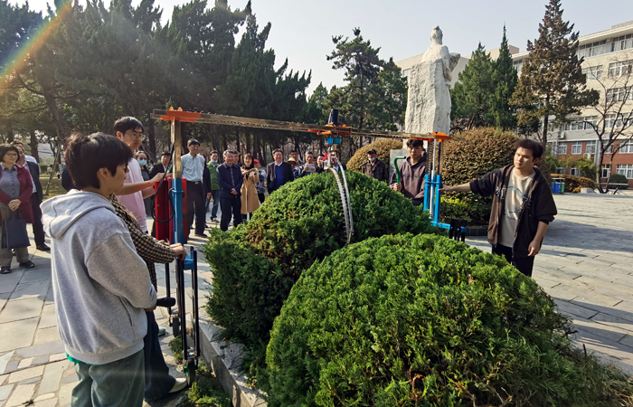 本网讯 3月9日下午,一场特别的测试吸引了师生目光。“我们设计的这个龙门式弧形绿植修剪机可以根据圆球绿植弧度大小进行调节修剪,通过操控柄一键操作”,工学院2020级农机专业的李成志同学一边操控着他和团队刚刚研制出来的绿植修剪机,一边忙着向领导、专家和媒体记者解说。置机、调试高度和角度之后,十几秒的时间,一个弧形的龙柏球就被修剪得正圆且平整光滑。