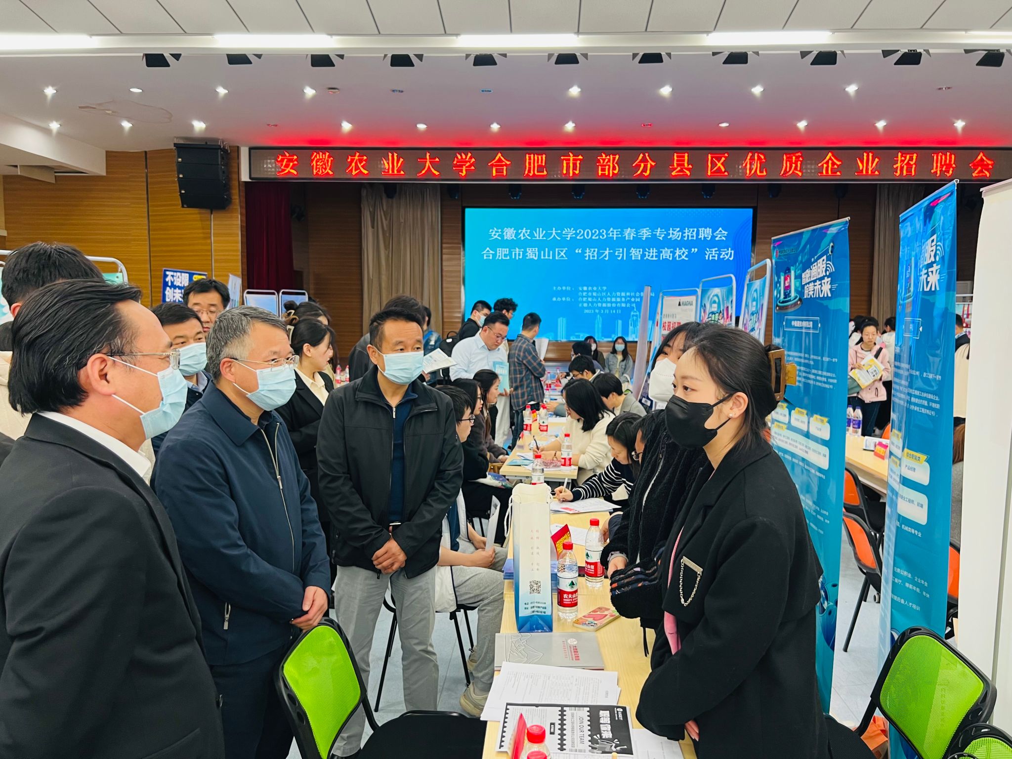 本网讯 玉兰花开春意浓,3月14日上午,来自肥西县、长丰县、蜀山区、合肥综合性国家科学中心大健康研究院等多个县区及协会入校举办招聘会。招聘会在欣苑四楼大学生活动中心举办,校党委书记常业军,党委常委、副校长操海群到场访企拓岗,并与参会企业、毕业生亲切交流。