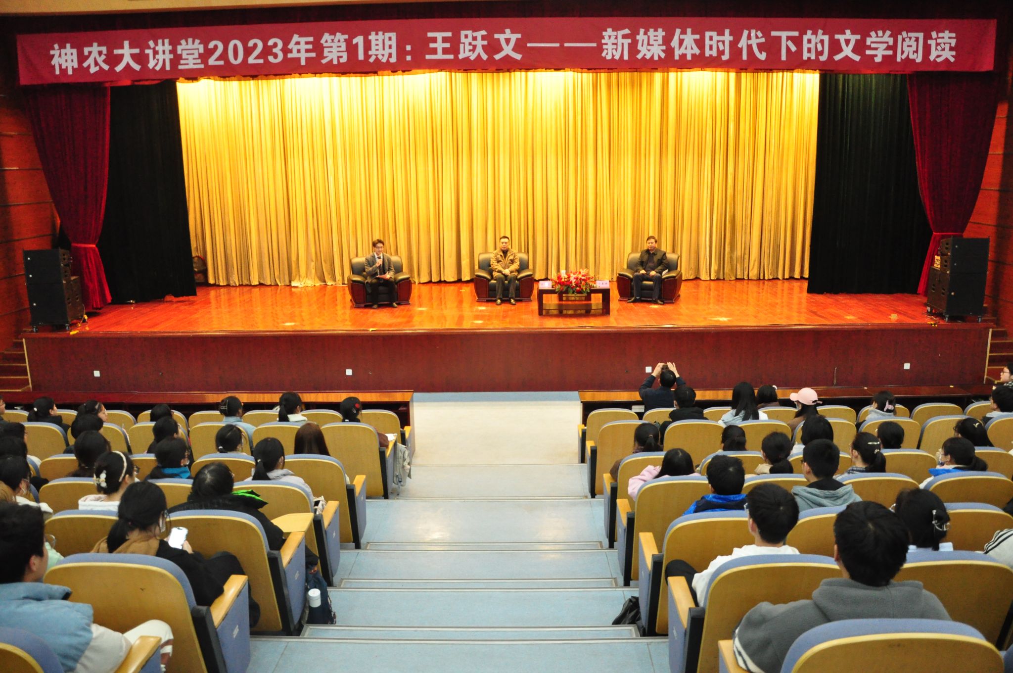 本网讯 3月17日晚,中国作家协会主席团委员王跃文做客我校2023年第1期“神农大讲堂”,中国作协全委会委员、安徽省作家协会主席许春樵陪同参加,为师生带来了一场主题为“新媒体时代下的文学阅读”互动访谈活动。活动前,校党委副书记裴树东会见了嘉宾一行。全校400余名师生共同聆听了讲座。