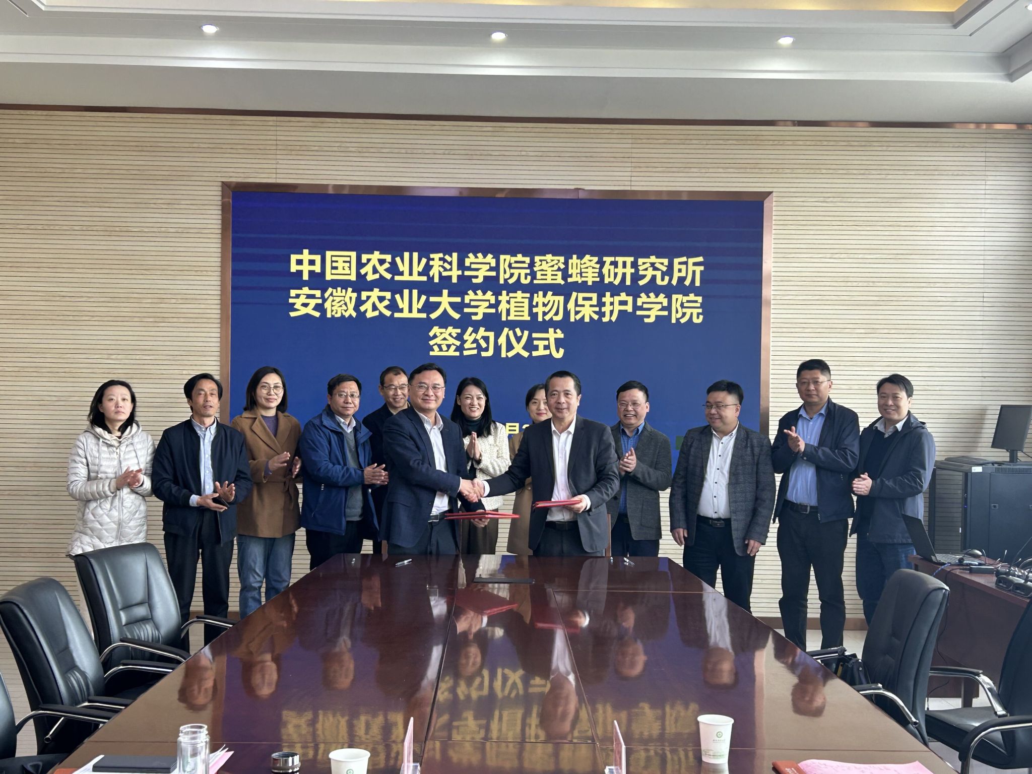 本网讯 3月26日,中国农业科学院蜜蜂研究所与我校植物保护学院联合培养研究生签约仪式在我校举行。中国农业科学院蜜蜂研究所所长彭文君、副所长吴黎明,我校党委常委、副校长操海群,安徽省畜牧技术推广总站站长张莉,安徽省植物保护总站副站长何振辉,国家蜂产业技术体系岗位科学家,我校植物保护学院教授代表以及多名专家共同出席签约仪式。