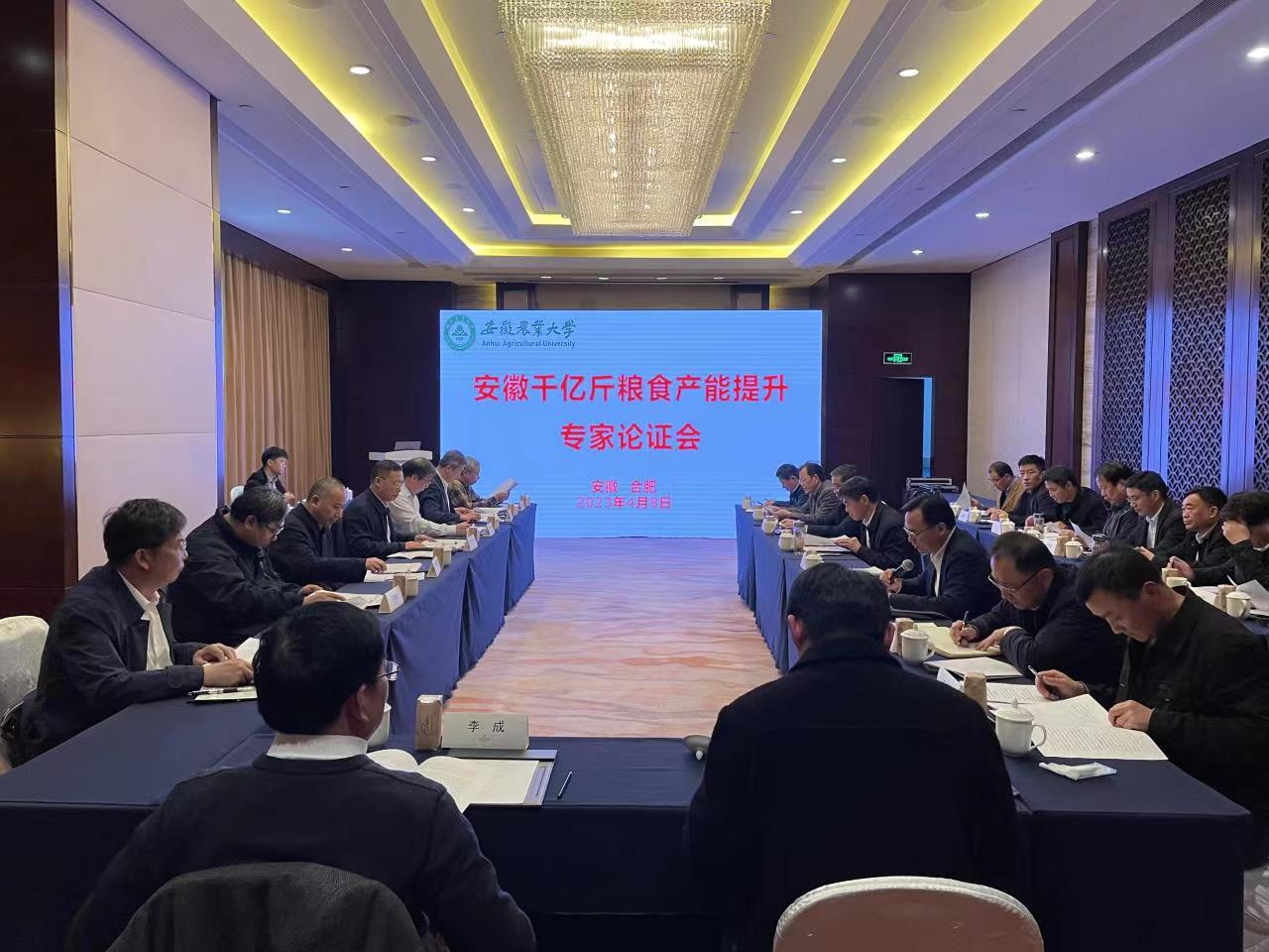 本网讯 为响应国家新一轮新增千亿斤粮食产能提升行动,谋划安徽千亿斤粮食产能建设,4月8日下午,我校在合肥组织召开安徽千亿斤粮食产能建设专家论证会。出席论证会的专家有农业农村部规划设计研究院院长、研究员张辉,中国农业科学院作物科学研究所党委书记、研究员刘录祥,中国社会科学院农村发展研究所研究员李国祥,中国农业科学院农经所研究员钟钰,中国农业科学院农经所研究员王秀东,中国农业科学院水稻研究所研究员章秀福,黑龙江省农业科学院研究员曹靖生。校党委常委、副校长操海群主持论证会。