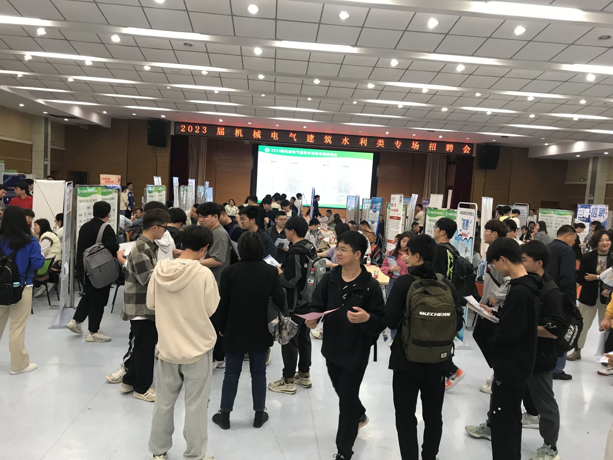 本网讯 4月14日上午,我校在欣苑四楼大学生活动中心举办2023届机械电气建筑水利类毕业生专场招聘会。校党委常委、副校长李红,招生就业处、工学院负责同志到场访企拓岗,与参会企业、校友、毕业生亲切交谈。