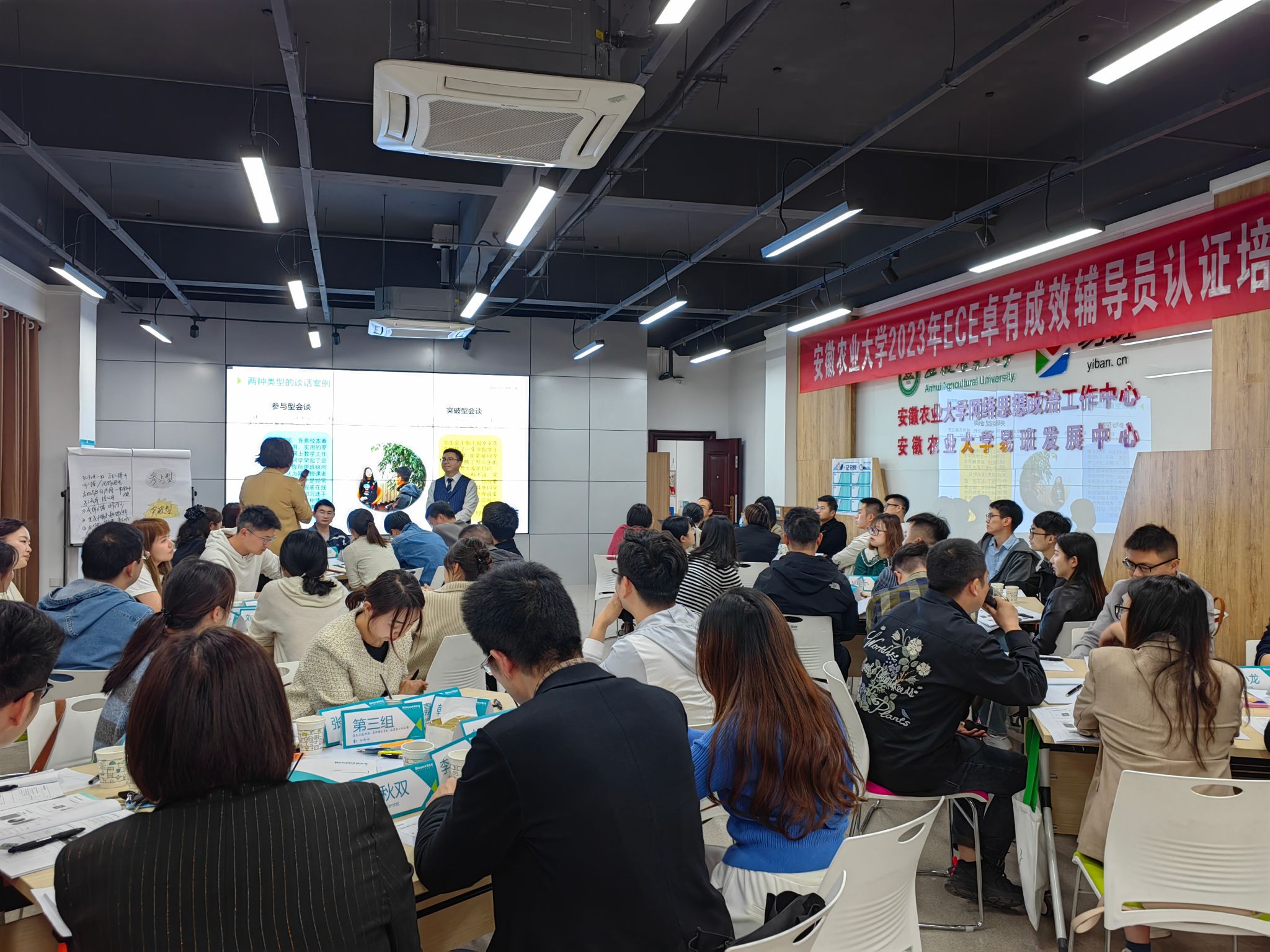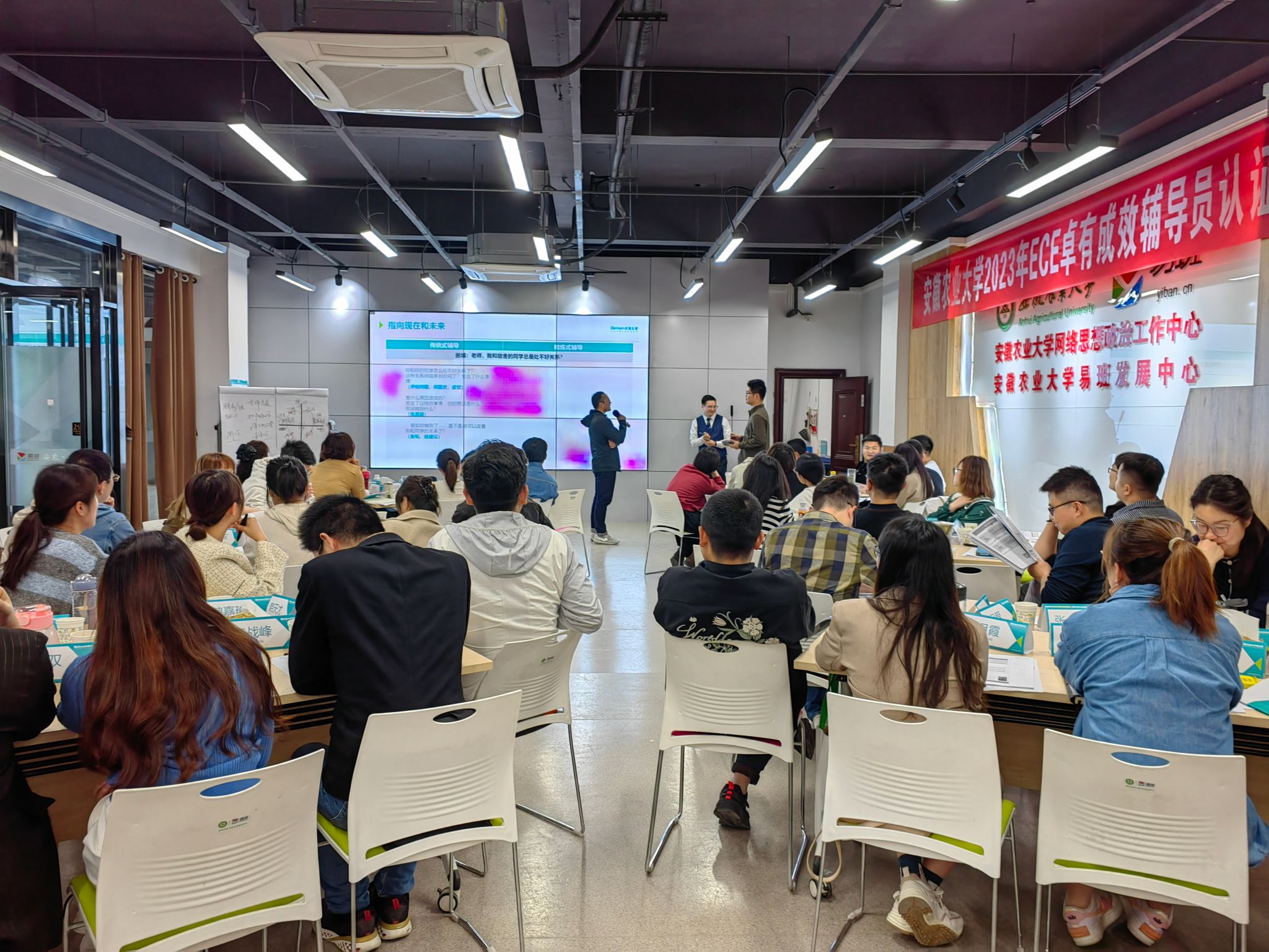 本次培训为期三天,由北森生涯团队陈尚飞主讲,主要立足于辅导员谈心谈话,围绕如何提高谈话效果,成为卓有成效的辅导员而展开。课程就如何做好学生的目标管理、动力提升、资源挖掘、行动促进四个模块分别展开了深入细致的讲解。在理论讲解环节,辅导员认真听讲,踊跃答题,与授课老师积极互动;实战演练环节,辅导员积极参与,互相借鉴,或两两配合,或小组讨论,或登台演示,用不同的形式练习刚学到的知识。