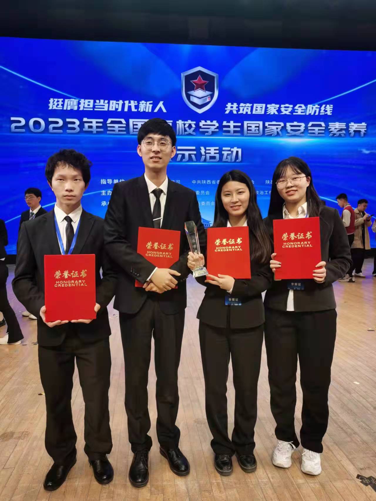 本网讯 4月12日-13日,2023年全国高校学生国家安全素养展示活动在长安大学举行,28支高校代表队参加了本次展示活动,我校代表安徽省参加展示并获得“追梦团队”荣誉称号。