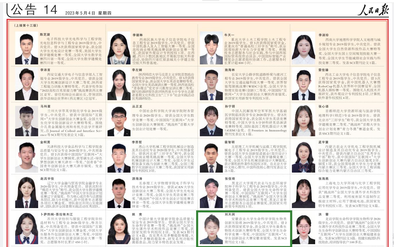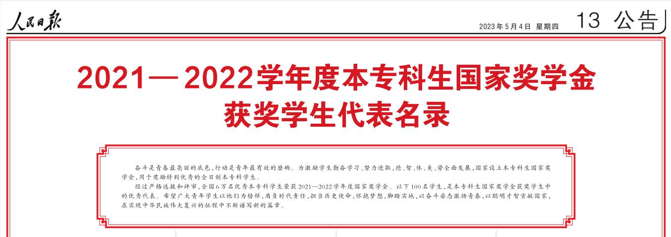 本网讯 5月4日,人民日报在“五四”青年节刊登《2021-2022学年度本专科生国家奖学金获奖学生代表名录》,我校学子刘天润作为全国6万名优秀本专科国家奖学金遴选的100名优秀学生代表入选名录,是本次上榜的安徽省属高校本专科学生唯一代表,也是我校国家奖学金获奖学生四年来第三次代表安徽省高校荣登名录。