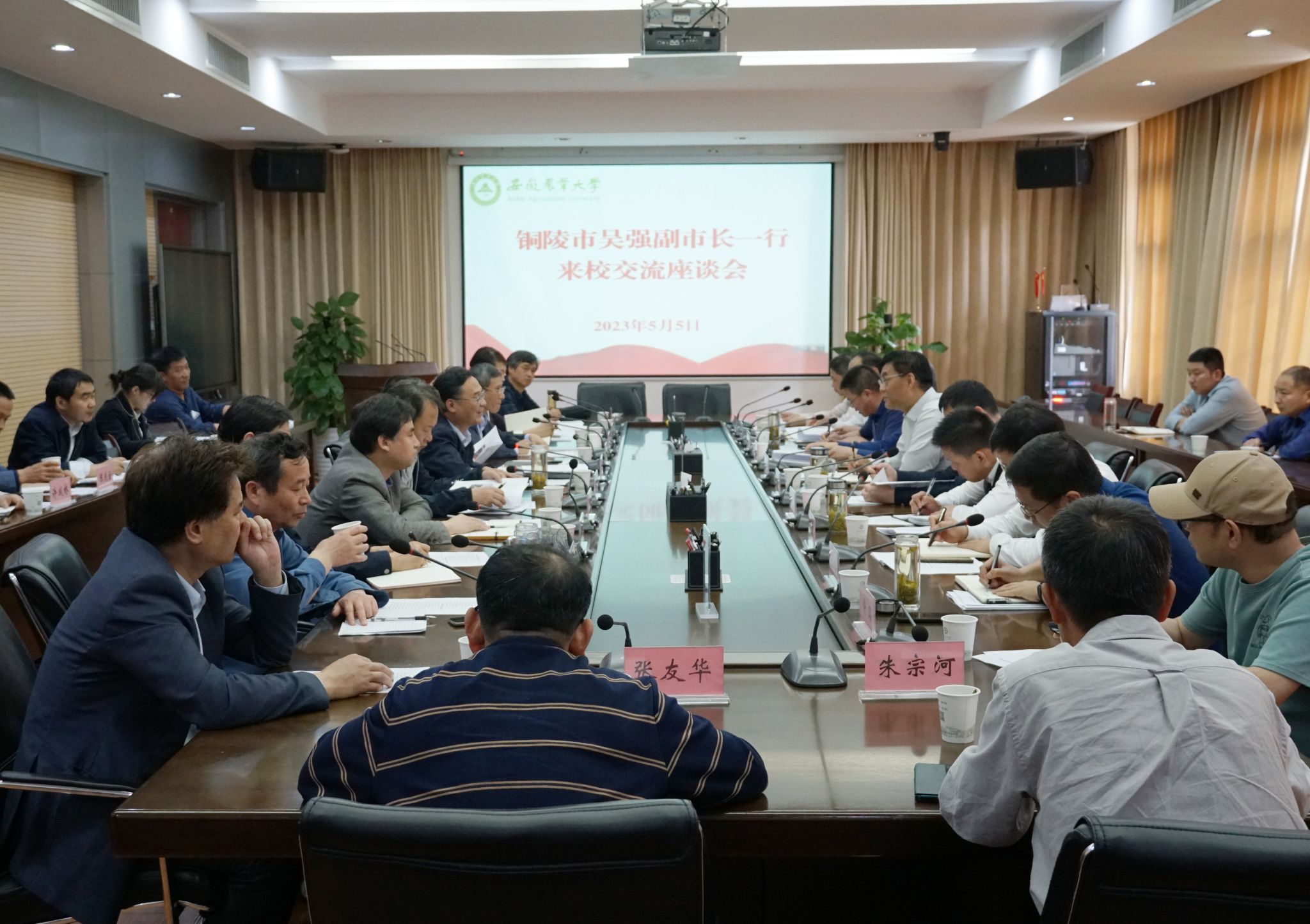 裴树东对吴强一行表示热烈欢迎。他指出,学校与铜陵市开展全面战略合作,打造“两强一增”示范区,助力国家新一轮千亿斤粮食产能提升,既是贯彻落实党的二十大精神,也是开展学习贯彻习近平新时代中国特色社会主义思想主题教育的生动实践。他希望校市双方加强沟通协作,共同助力铜陵市农业农村现代化,为全省粮食产能提升作出更大贡献。
