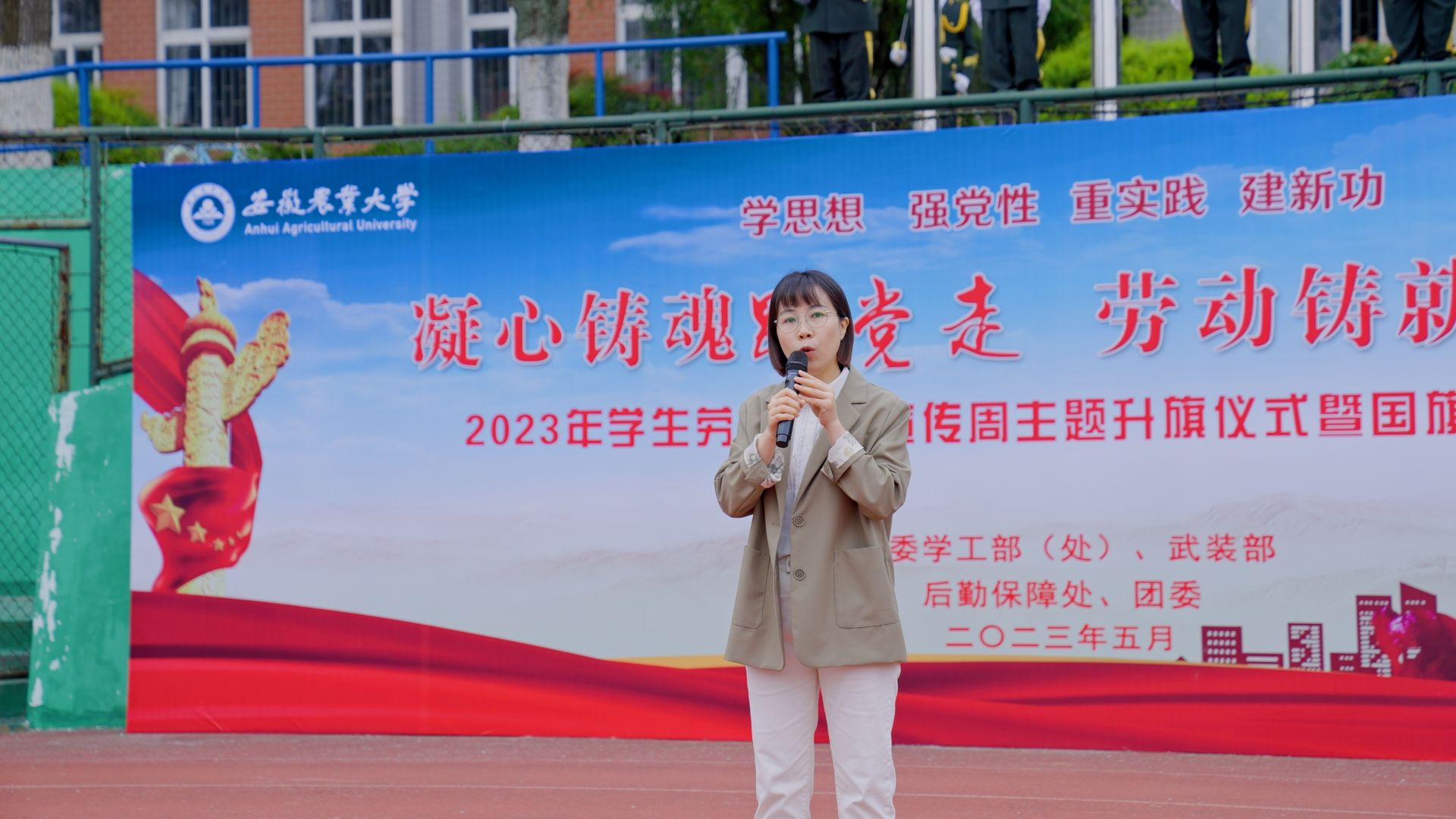 马克思主义学院王晶晶副教授以“何为劳动,劳动何为”为主题讲授国旗下的公开课《马克思主义劳动观》。来自大学生舞蹈团的学生代表,用一曲欢快的舞蹈《日出》,深情演绎了安农学子尊崇劳动、热爱劳动的精神风貌。来自教师代表们的诗朗诵《劳动者之歌》,讴歌了每一位勤劳的安农人,用点滴平凡汇聚成立德树人、服务育人的生动实践。