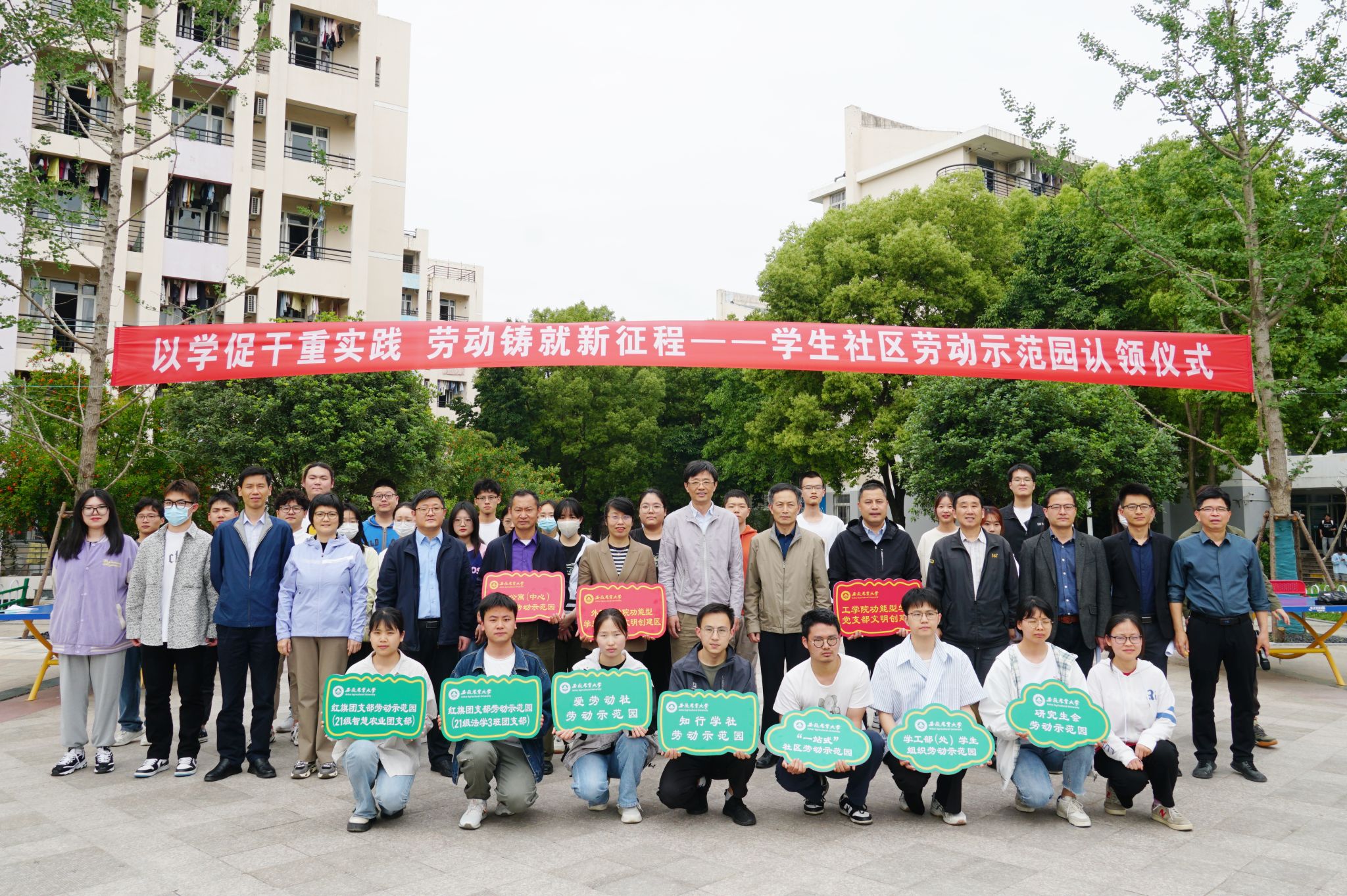 本网讯 近日,主题为“以学促干重实践,劳动铸就新征程”的学生社区文明创建区、劳动示范园认领仪式在学生社区北区广场举行。党委常委、副校长韩军出席仪式并为相关单位授牌。党政办、党委组织部、党委研工部、党委学工部、校团委、后勤保障处、工学院、外国语学院等部门负责同志和学生代表等50多名师生参与了授牌仪式。授牌仪式由后勤保障处负责同志主持。