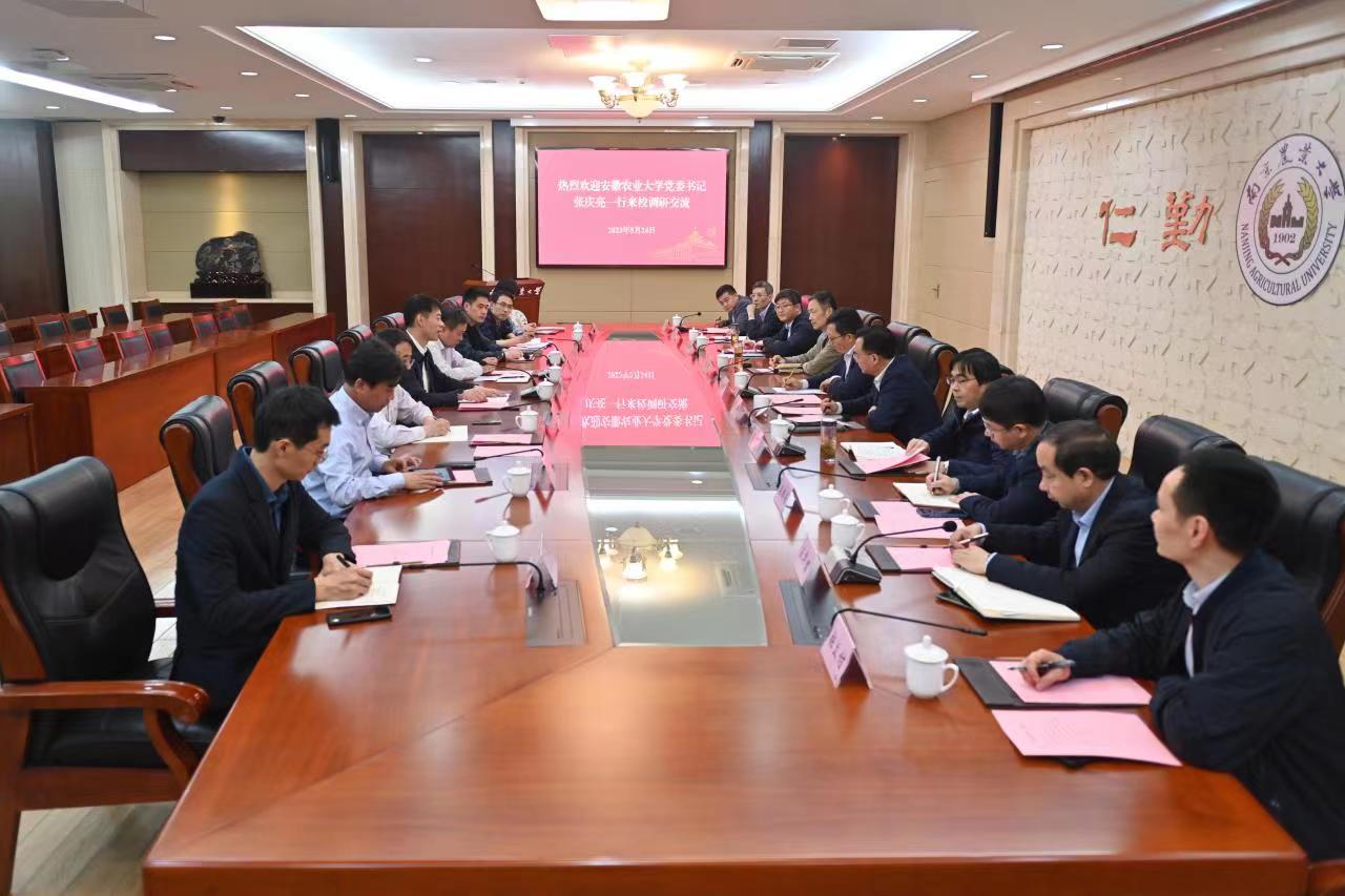 本网讯 为推深做实学习贯彻习近平新时代中国特色社会主义思想主题教育,推动学校事业高质量发展,深化与南京农业大学战略合作,5月24日-25日,校领导张庆亮、操海群率队到南京农业大学学习调研,受到南京农业大学党委书记王春春,南京农业大学党委副书记、纪委书记吴荣顺的热情接待。