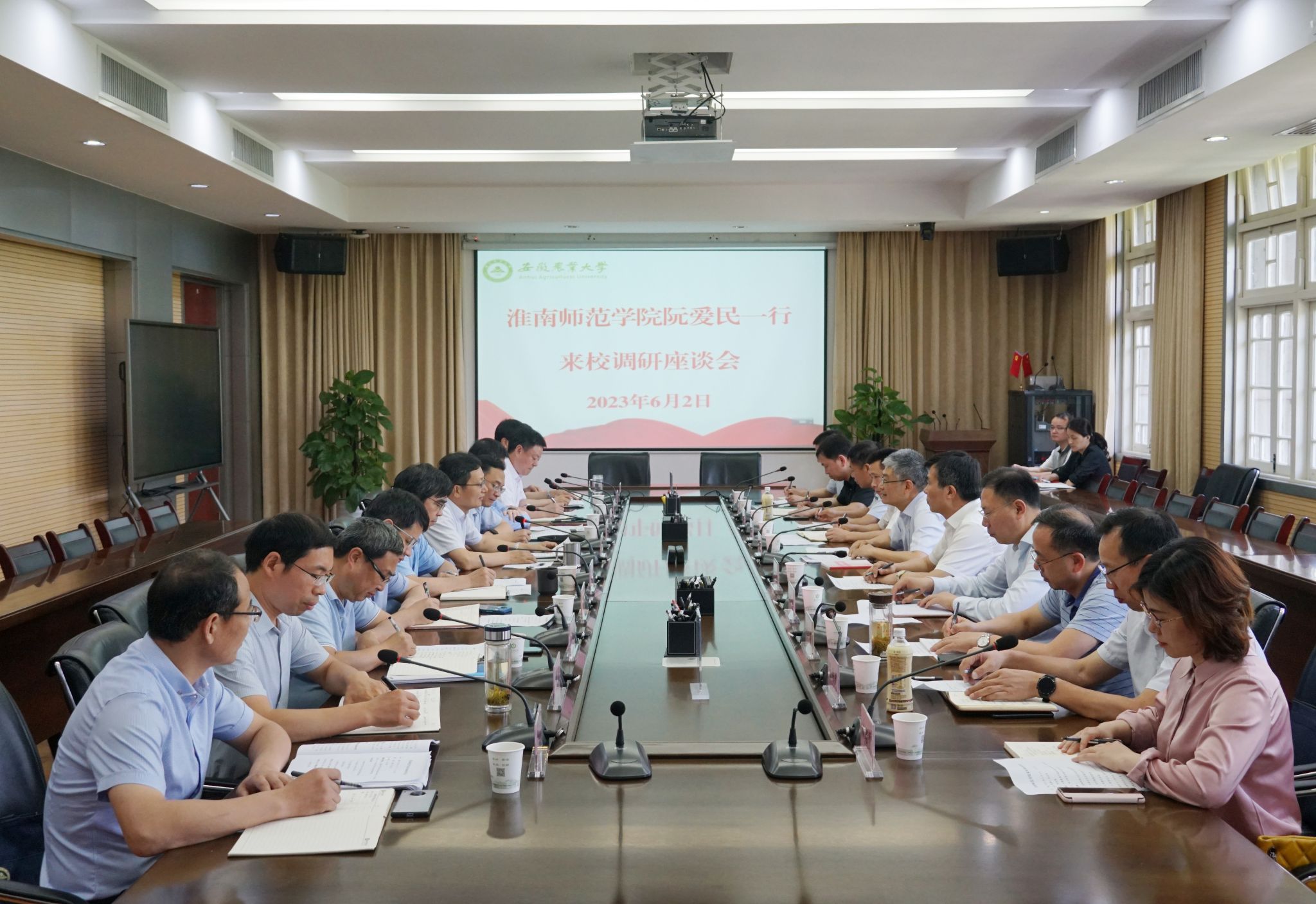 本网讯 6月2日,淮南师范学院党委书记阮爱民、校长程刚带队来校调研交流。校党委书记张庆亮,党委常委、副校长操海群出席座谈会。两校相关职能部门负责人参加座谈会。