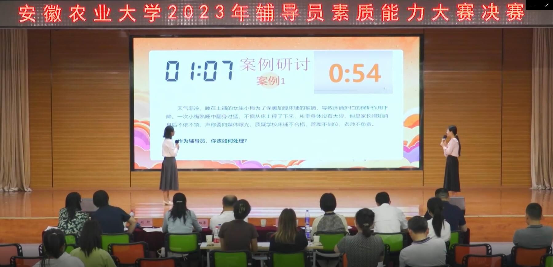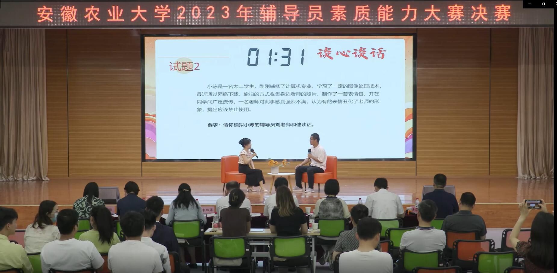 本次大赛共有96名专职辅导员参加基础能力测试,历时一个多月,经过笔试和主题班会教案评选,共有10位辅导员竞技决赛。决赛包括谈心谈话和案例研讨两个环节。