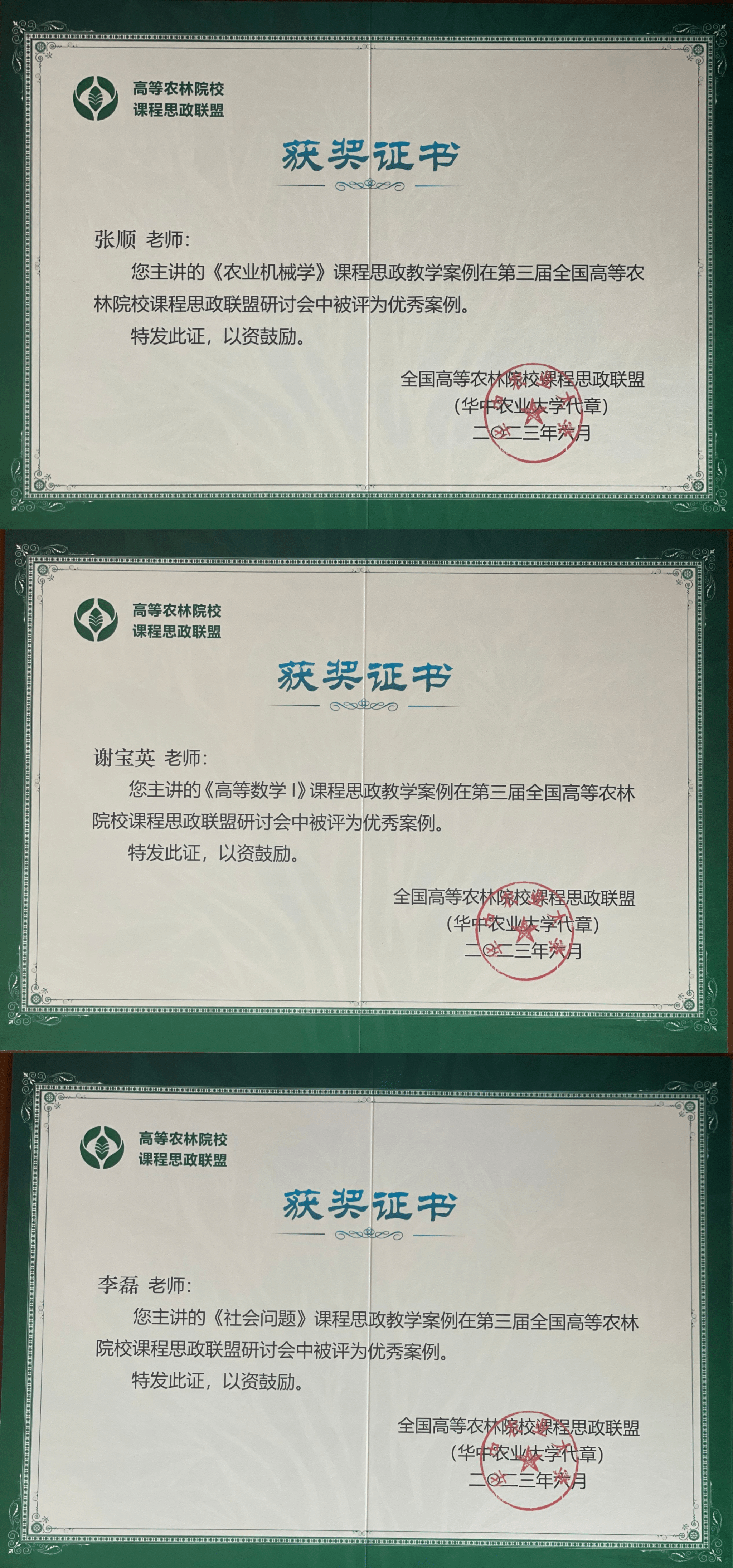 本网讯 6月2日-6月4日,由高等农林院校课程思政联盟主办,东北农业大学承办的第三届全国高等农林院校课程思政建设研讨会在哈尔滨举行,会议围绕“促进课程思政高质量发展,加快推进新农科建设”展开研讨,并评选出课程思政优秀案例。我校教师李磊主讲的《社会问题》、谢宝英主讲的《高等数学I》、张顺主讲的《农业机械学》入选全国高等农林院校课程思政联盟优秀案例。