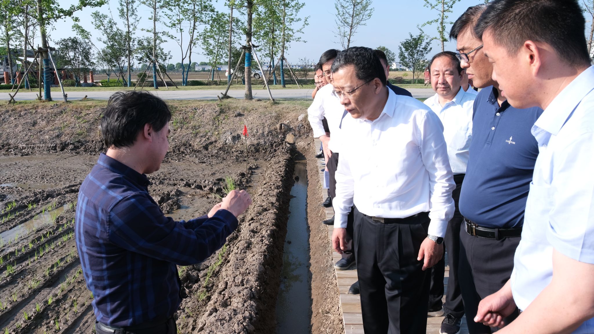 本网讯 6月6日,学校与普农集团共建的稻-麦两熟绿色丰产增效万亩示范区在芒种季节开始水稻机插。铜陵市委书记丁纯,市委常委、秘书长马军,副市长吴强,市农业农村局、普农集团、郊区政府负责人以及我校新农院、高质量发展专班负责人和部分专家团成员现场观摩了示范区插秧。
