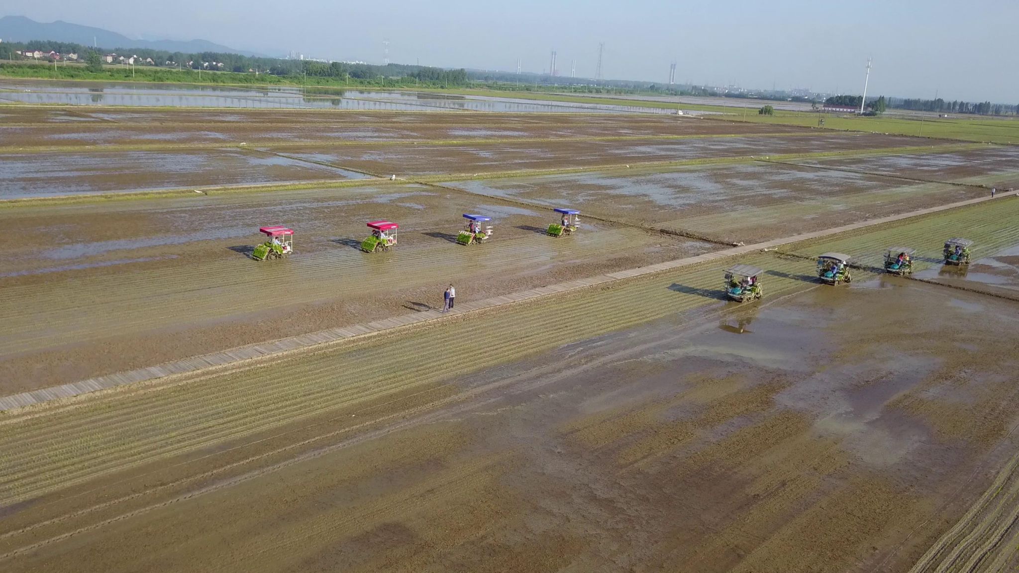 示范区现场,学校普农专家团队通过综合应用良种良法配套以及实施农机农艺农信融合,水稻育秧苗齐苗匀苗壮,机插秧苗直、横成趟竖成行,现场一派忙碌的景象,数台高速插秧机正在田间依次前进作业,插秧机所过之处,一排排水稻秧苗翠绿壮实,横平竖直且深浅一致,呈现出一幅壮美夏播风景图。