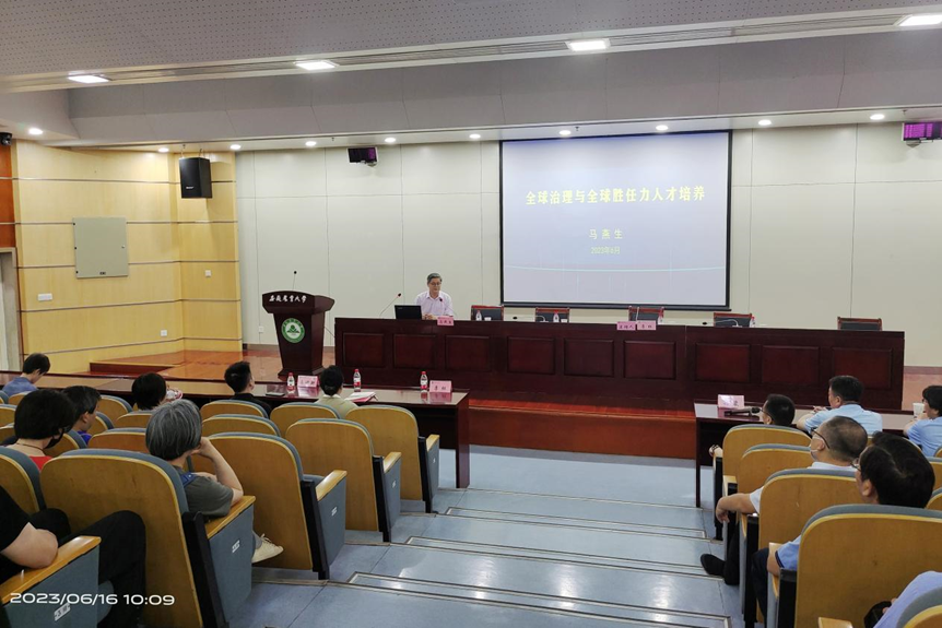 马燕生在图书馆第二报告厅作了《全球治理与全球胜任力人才培养》专题培训。他结合自身工作经历、国外见闻、教育理念,为大家深入浅出地解读了“什么是全球治理”、“中国参与全球治理的历史与现状”、“中国参与全球治理面临的困难和挑战”和“国际组织人才与全球胜任力核心素养”等几方面的内容。他鼓励大家加强学习,开阔眼界,积极提升学校开放办学及国际化水平,推动中国更加全面深入参与国际事务和全球治理,推进“一带一路”建设和构建人类命运共同体做出更大贡献。李红主持会议。校相关部门负责人、各二级学院领导班子成员、办公室主任、外事联系人参加了培训。(一审:欧阳晓宇 二审:孙裴 三审:曹雷)