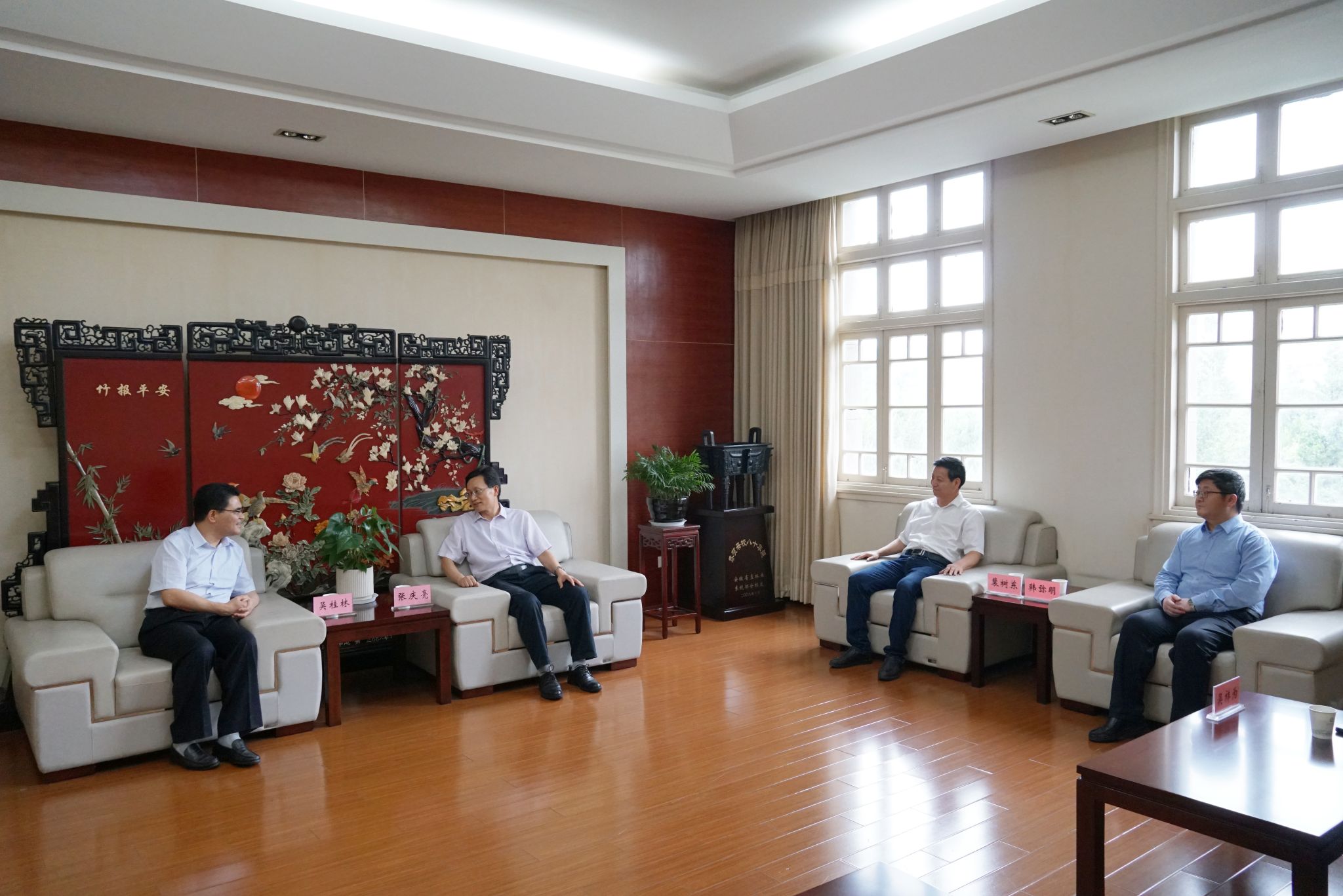 本网讯 6月19日下午,马鞍山市政协主席吴桂林一行访问我校并举办“才聚诗城高校行”活动。校党委书记张庆亮、副书记裴树东会见了吴桂林一行。校党委常委、副校长韩军出席座谈会。
