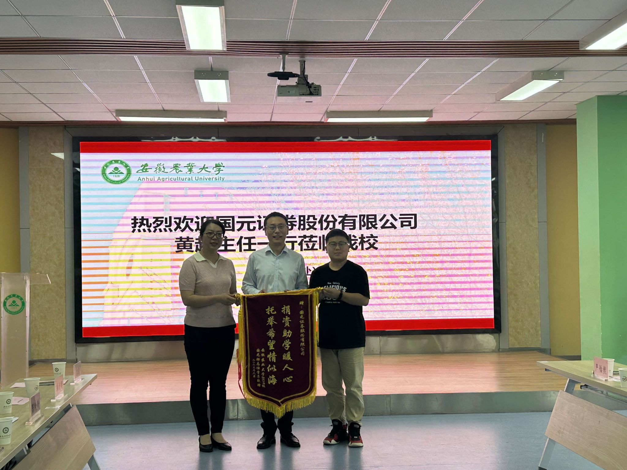 座谈会上,校学生资助管理中心负责老师介绍了2023届国元励志班日常管理和受助学生四年来的成长情况。学生代表们结合自身经历,汇报了大学期间取得的成绩和成长心得,纷纷表达了对学校和国元证券股份有限公司的感谢,并向国元证券股份有限公司赠送了锦旗。