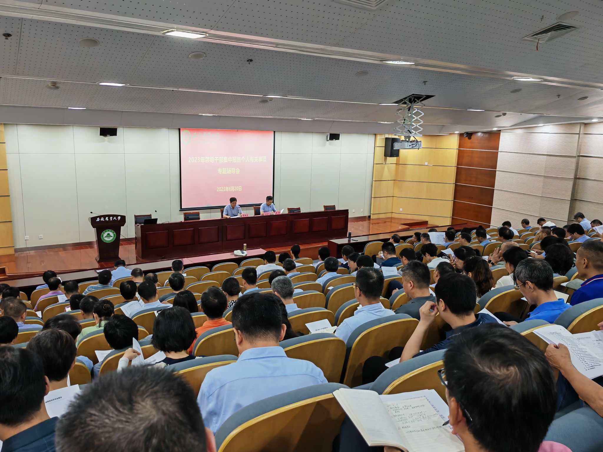 本网讯 6月20日,学校在图书馆第二报告厅举办2023年领导干部集中报告个人有关事项专题辅导会。校党委副书记裴树东出席会议并做讲话。全校处级干部参加了培训会。培训会由组织部负责同志主持。