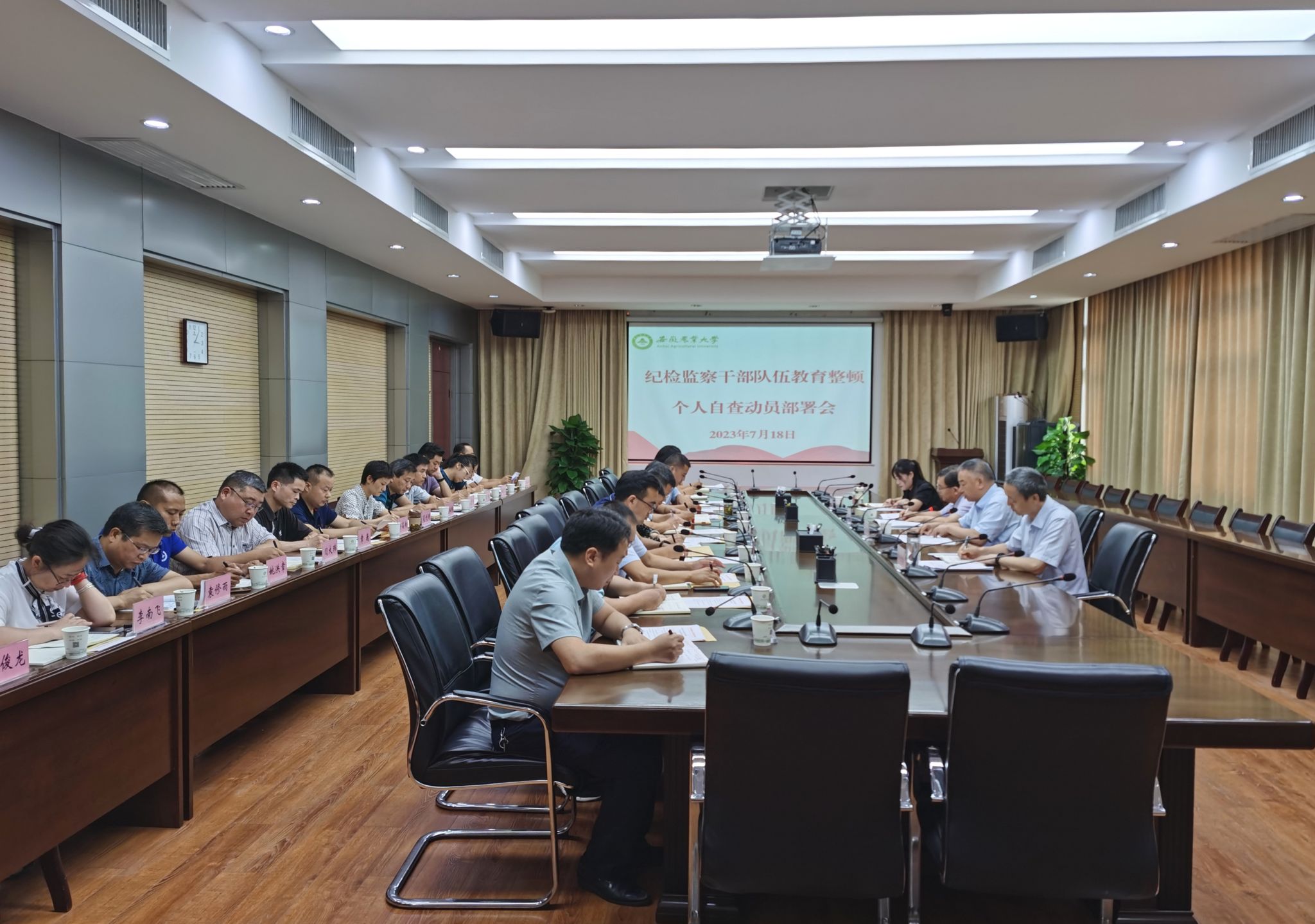 本网讯 7月18日下午,校纪委组织召开教育整顿个人自查动员部署会。省纪委监委二级巡视员、省教育整顿第八督导组副组长王在胜,省教育整顿第八督导组成员、合肥师范学院纪委办纪检监察室副主任江丽到会指导。校党委常委、纪委书记、监察专员陈文兵主持会议。校二级纪委书记和纪委办、巡察办全体人员参会。