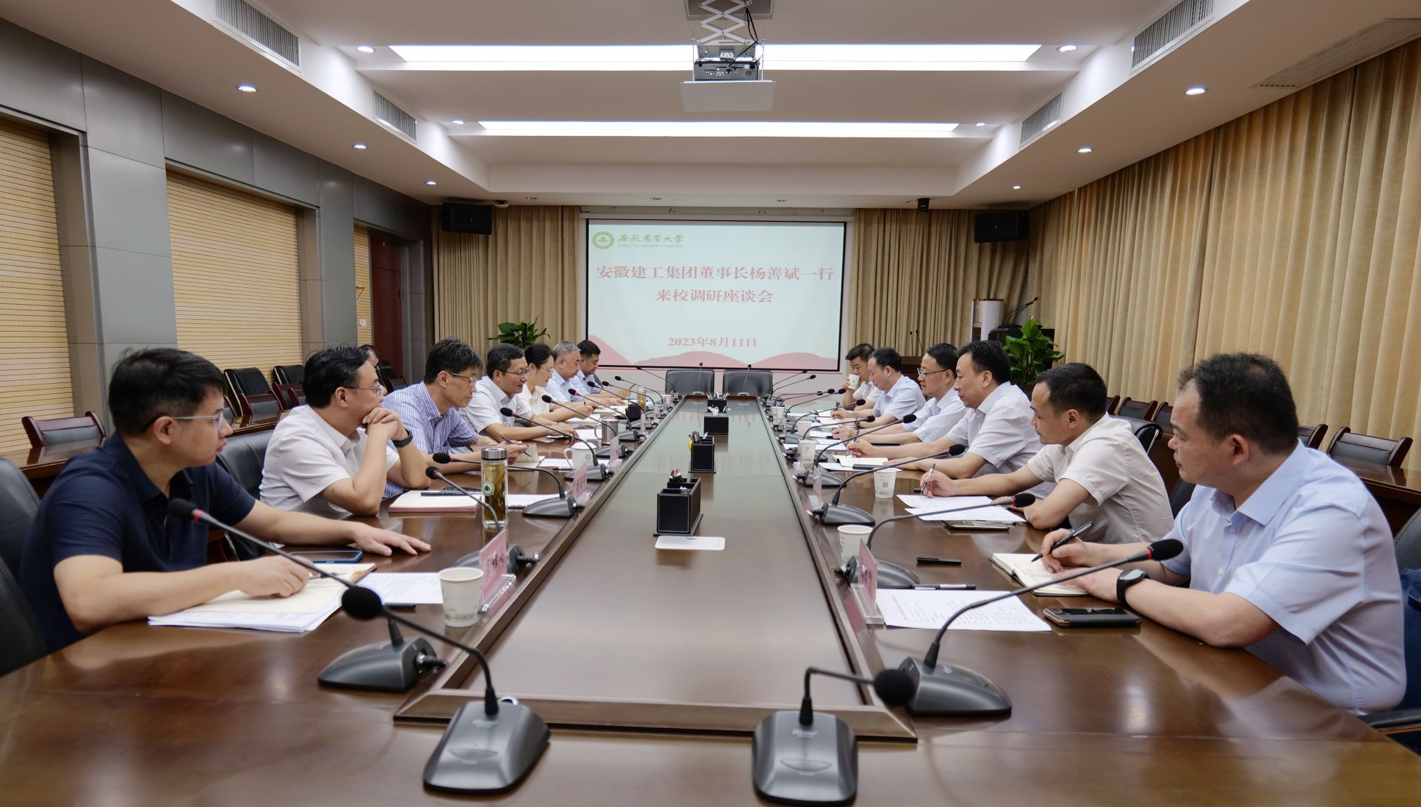本网讯 8月11日上午,安徽建工集团控股有限公司党委书记、董事长杨善斌率队来校考察交流。校党委书记张庆亮主持召开座谈会。安徽建工集团控股领导王汪苗、盛明宏,安徽建工股份领导张冲,校领导李红、韩军、陈文兵、操海群,以及双方有关单位和部门负责同志参加。