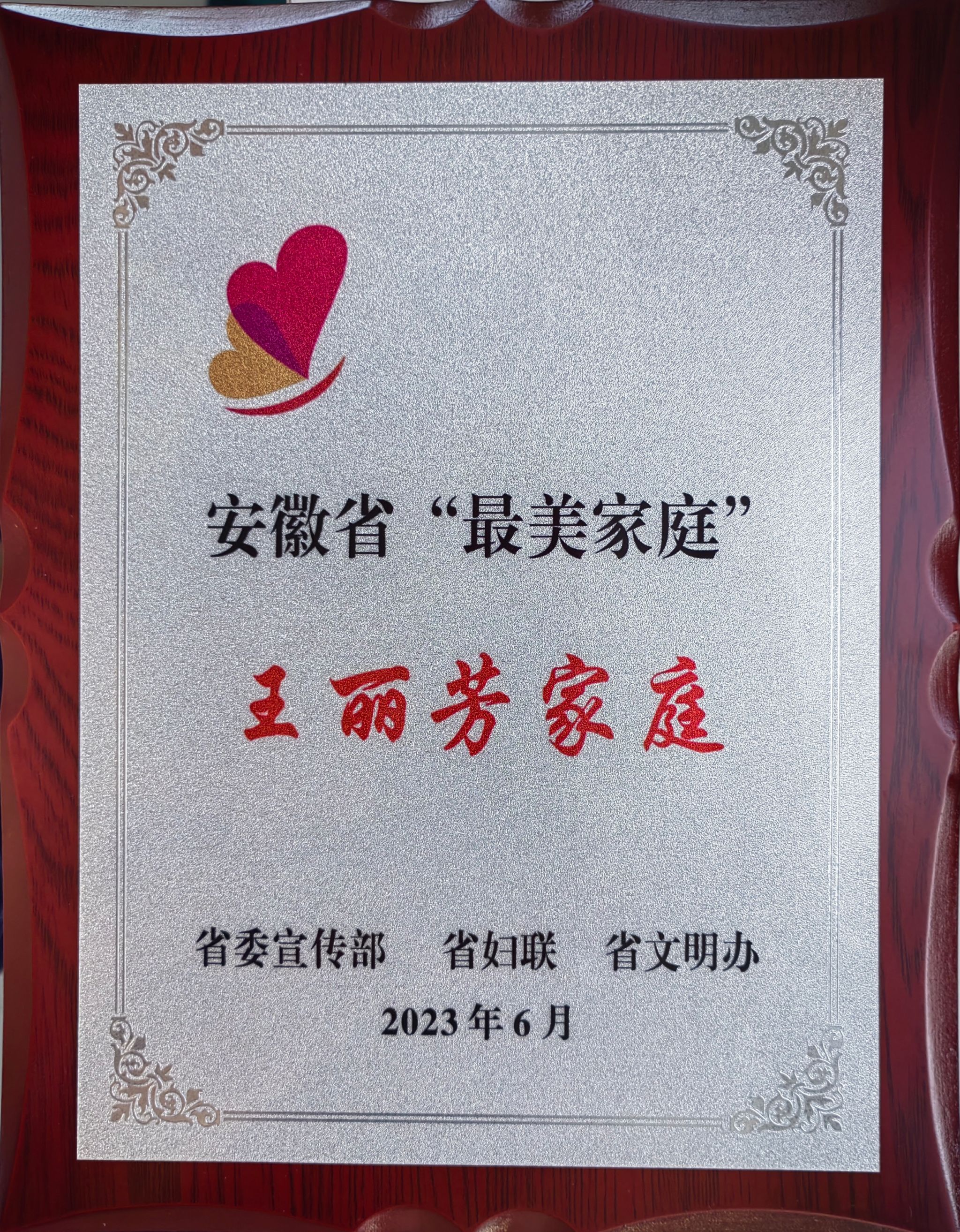 王丽芳,在我校园艺学院实验中心工作;她爱人党向利是我校高层次引进人才,植保学院副教授、硕士生导师。夫妻两次赴美留学,学成归来,报效祖国;他们教书育人,潜心科研,服务三农,助推乡村振兴建设,双双取得硕果累累;他们热爱集体,关爱社会,携孩子们一起参加公益活动;他们共同奋斗、勤俭持家,孝老爱亲,把日子过得红红火火;他们以身作则,率先垂范,树立好家风,培养优秀下一代。王丽芳家庭是万家灯火中平凡的那一盏,但他们爱岗敬业、孝老爱亲、自强自立、勤俭持家,在他们身上闪烁着平凡而耀眼的光芒。近年来,他们先后荣获2021年合肥市蜀山区“最美家庭”、2021年合肥市“最美家庭”、 第三届合肥市“文明家庭”等荣誉。