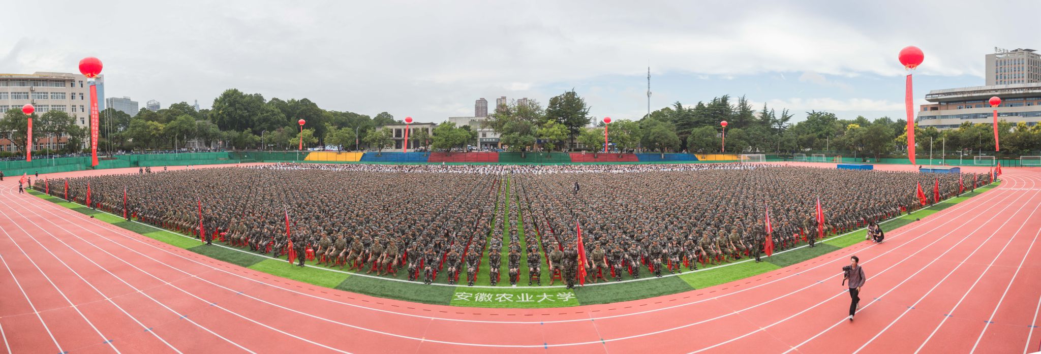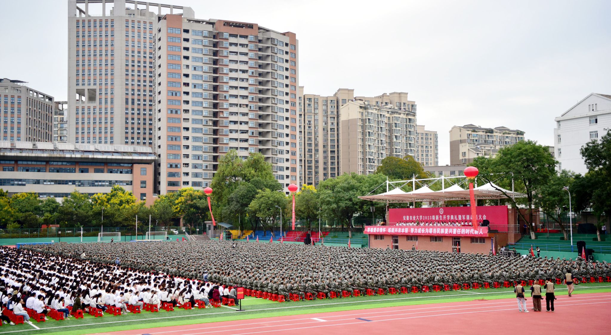 本网讯 9月14日上午,我校在田径运动场举行2023级新生开学典礼暨军训动员大会。校领导张庆亮、李红、陈文兵、操海群,承训单位领导出席会议。大会由校党委常委、副校长李红主持。机关相关部门、校直有关单位负责人及各学院负责人,新生辅导员以及2023级全体新生参加大会。