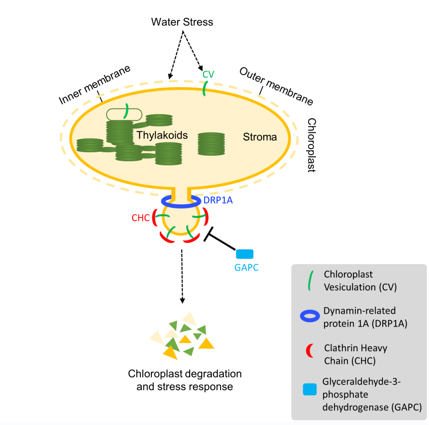 本研究发现,CV蛋白与网格蛋白重链(clathrin heavy chain 2, CHC2)相互作用,通过网格蛋白介导的胞吞作用来诱导叶绿体内被膜形成囊泡(如下图)。在CHC2基因突变体和编码激动蛋白(Dynamin-related protein 1A, DRP1A)基因的突变体中,CV诱导叶绿体囊泡的形成和从叶绿体上的分离被抑制,说明这两个基因对叶绿体胞吞囊泡的形成的切割分离是非常重要的。同时我们也发现定位于细胞质中的氧化型GAPC蛋白可以与CHC2竞争结合CV,从而抑制叶绿体囊泡的形成(如下图),过量表达GAPC1基因可以抑制CV导致的叶绿体降解和对干旱胁迫的敏感性。本研究不仅可以揭示了一条来自叶绿体被膜的新的胞吞途径,进一步完善了植物细胞内囊泡运输的调控网络,而且为研究叶绿体与胞质互作提供新的线索,并为农作物的抗旱性改良提供新的思路。